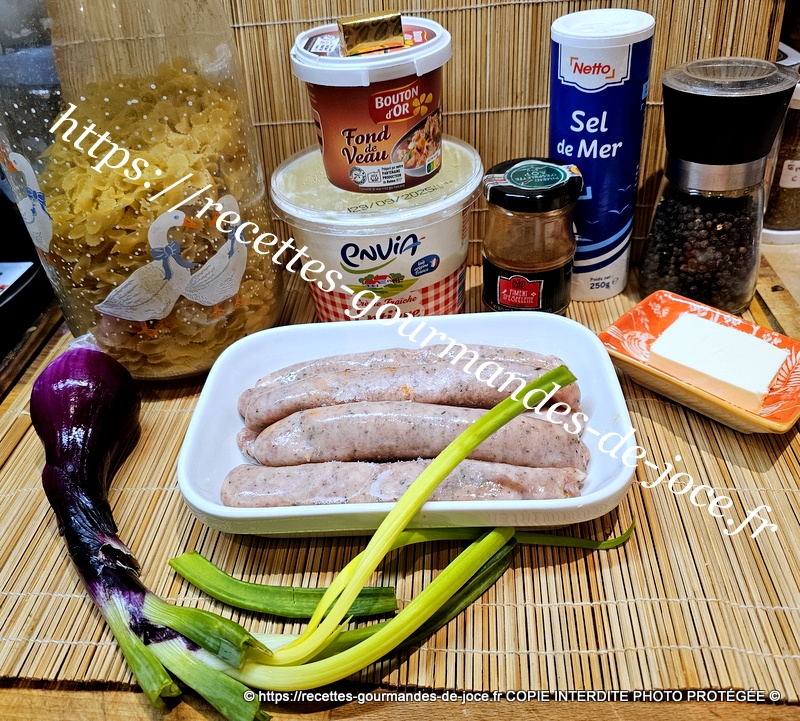 Couper les saucisses en morceaux, peler et hacher l’oignon, laver et ciseler ses tiges. Mettre une marmite d’eau salée avec le kub’or à chauffer, à l’ébullition, mettre les pâtes à cuire selon les indications du paquet et vos goûts. Dans une poêle mette un morceau de beurre à fondre.