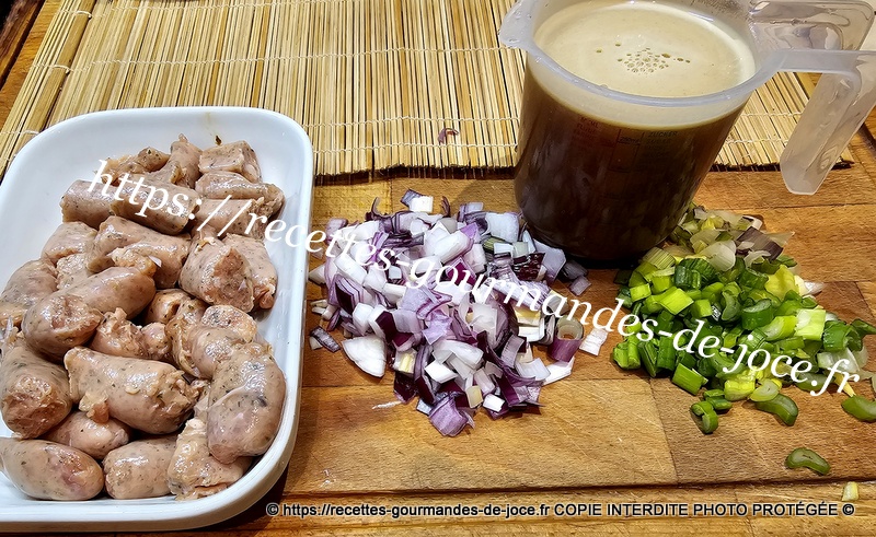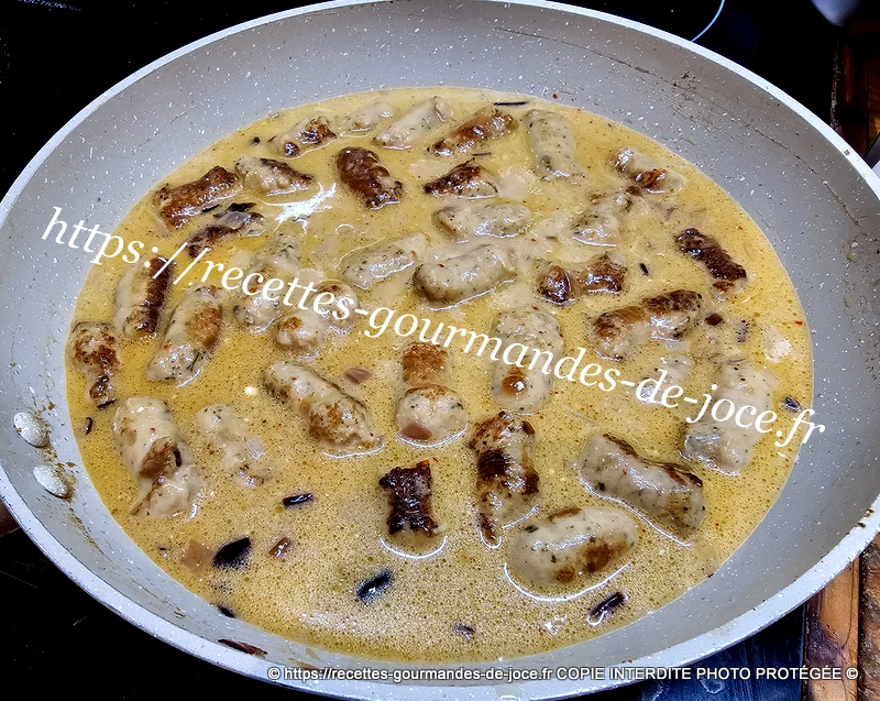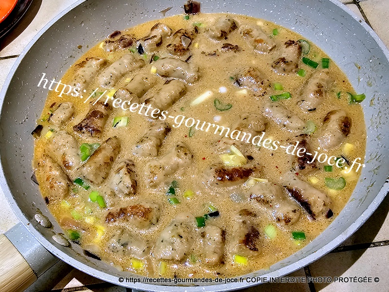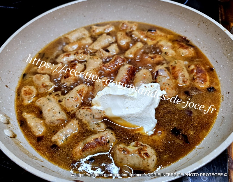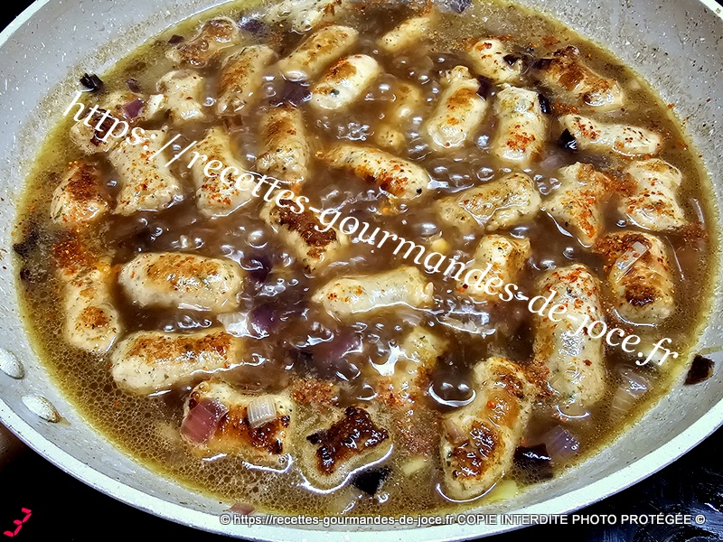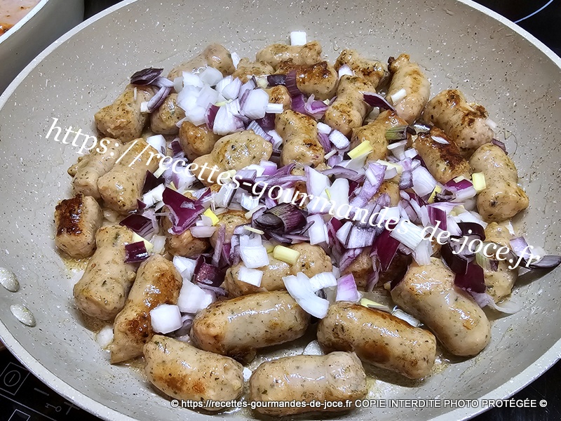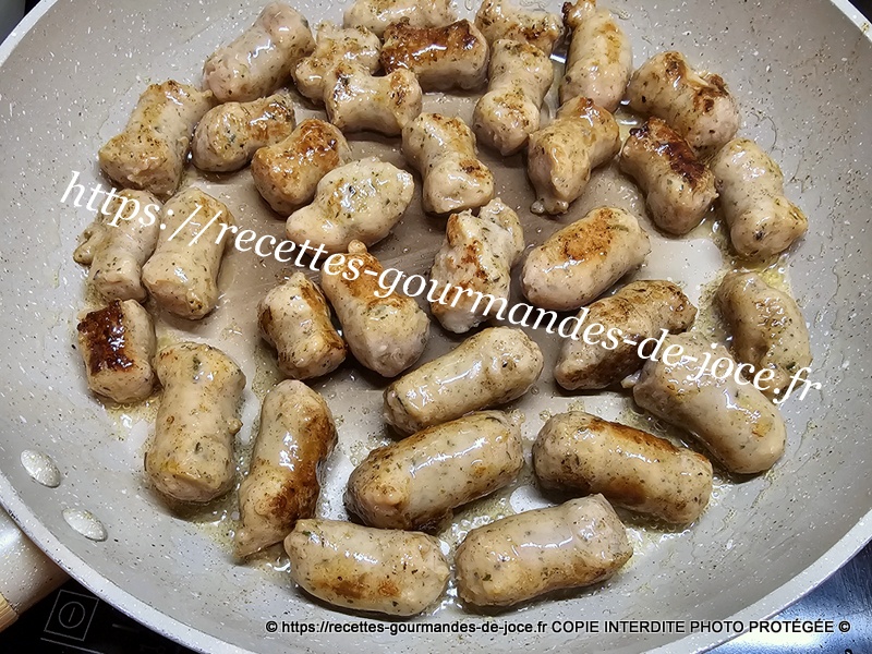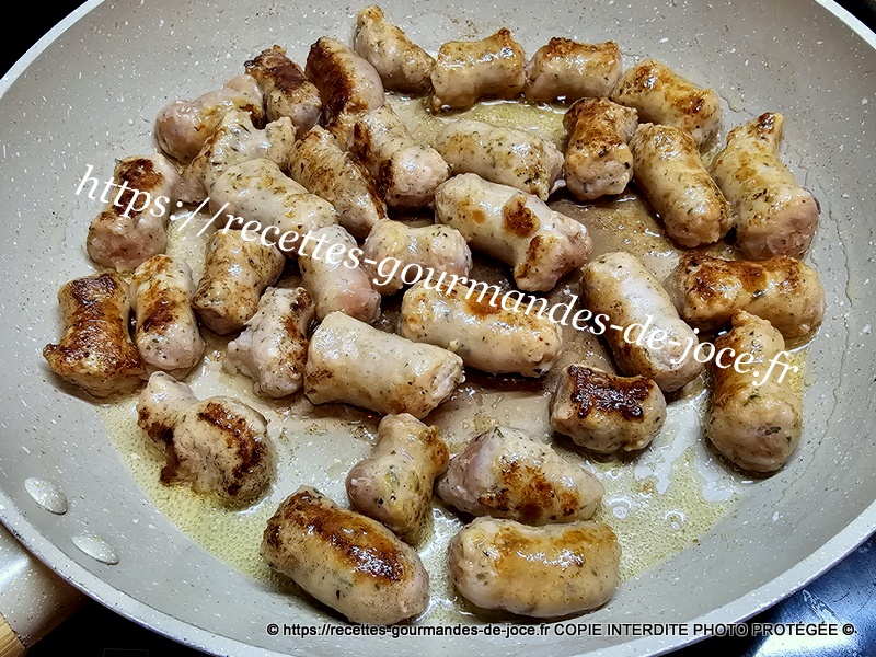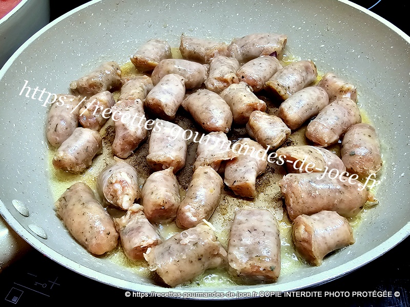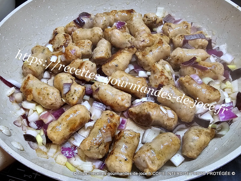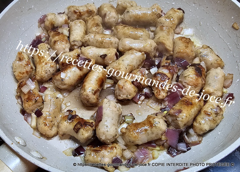 Lorsqu’il est fondu ajouter les saucisses et les faire dorer sur toutes les faces.