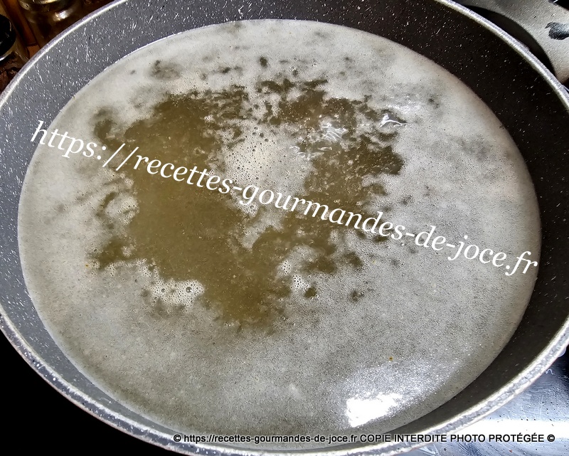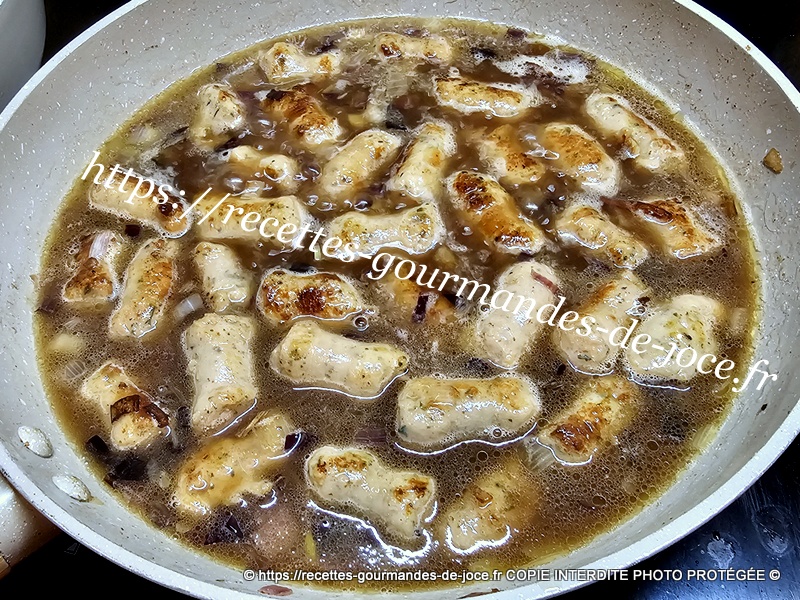 Lorsqu’ils sont cuits, ajouter le fond de veau et mélanger, laisser mijoter à feux doux, il faut que le jus réduise de moitié.