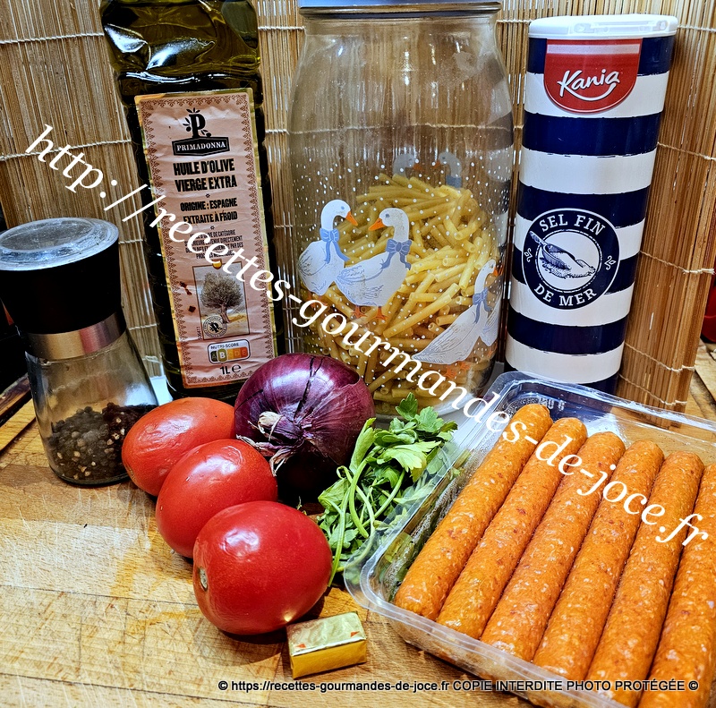 Couper les merguez en morceaux, laver et couper les tomates en petits dés, peler et émincer l’oignon, laver et ciseler le persil. Mettre une marmite d’eau salée à chauffer avec le kub’or, à l’ébullition ajouter les macaronis et les cuire selon les indications du paquet et vos goûts.