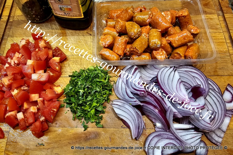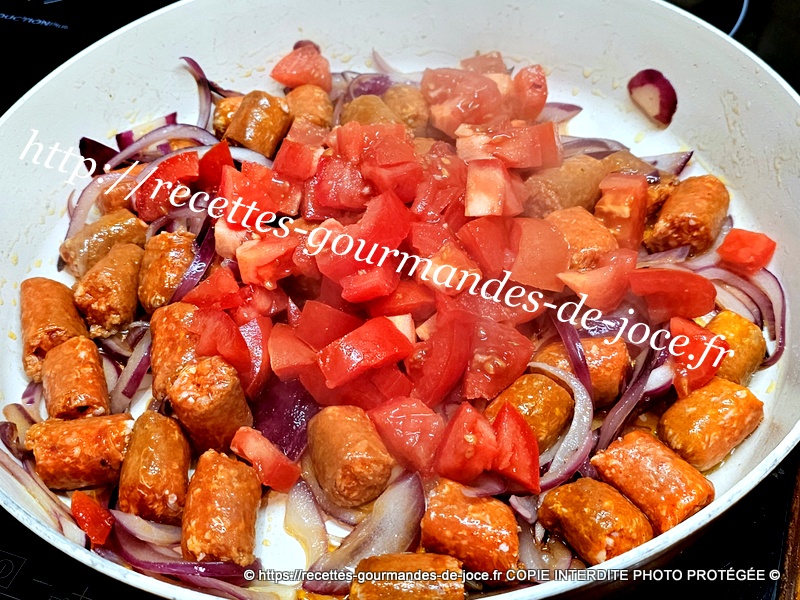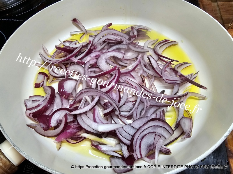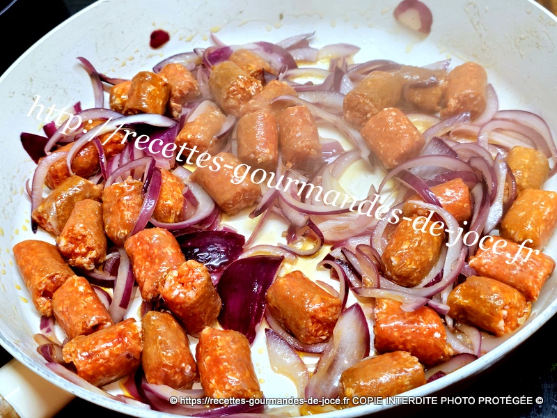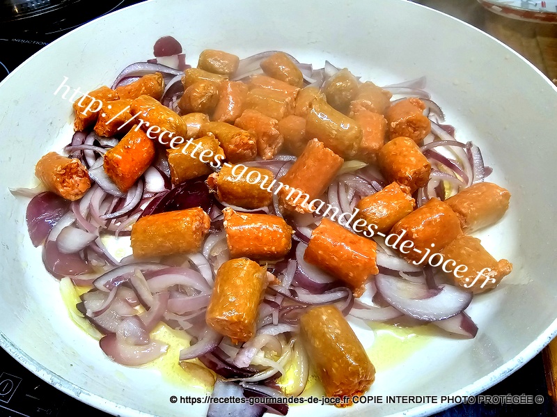 Pendant ce temps mettre un filet d’huile d’olive dans une poêle et y faire suer les oignons, ajouter ensuite les morceaux de merguez.