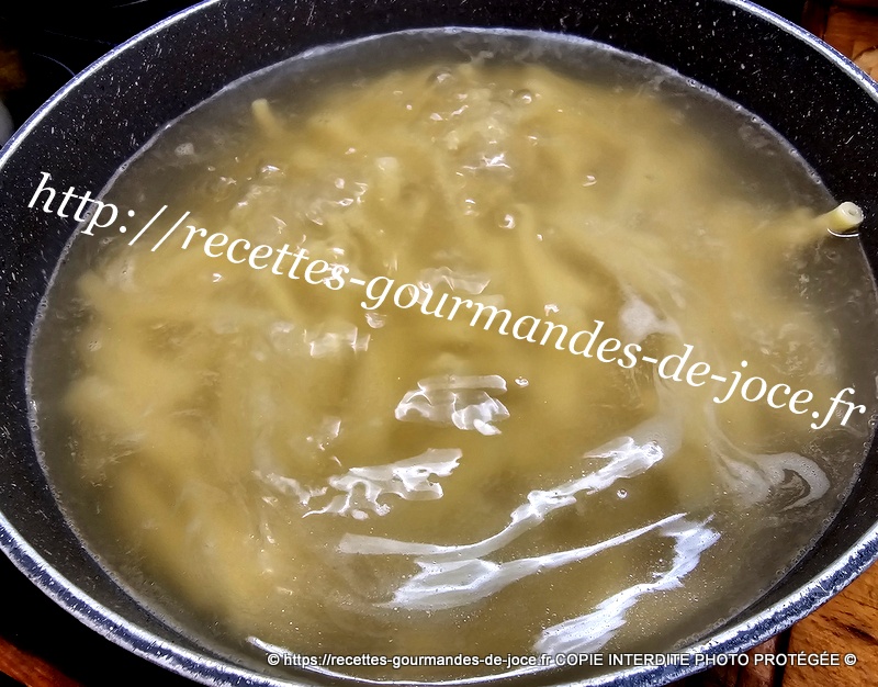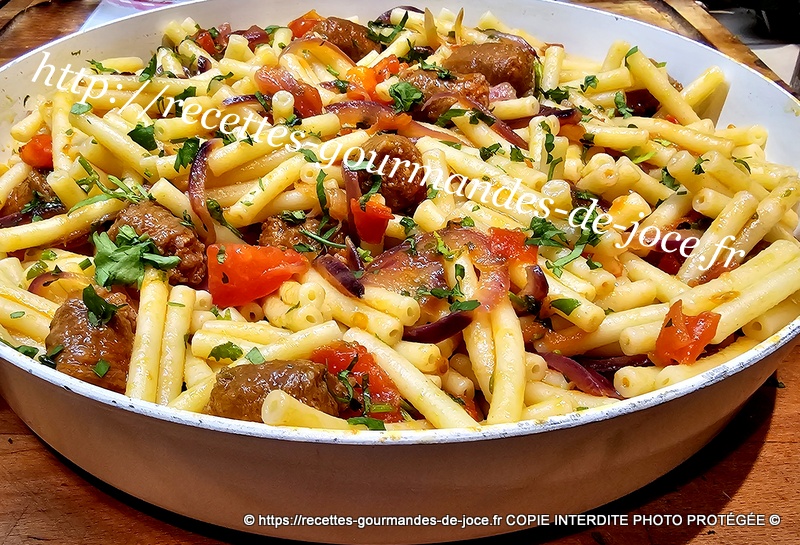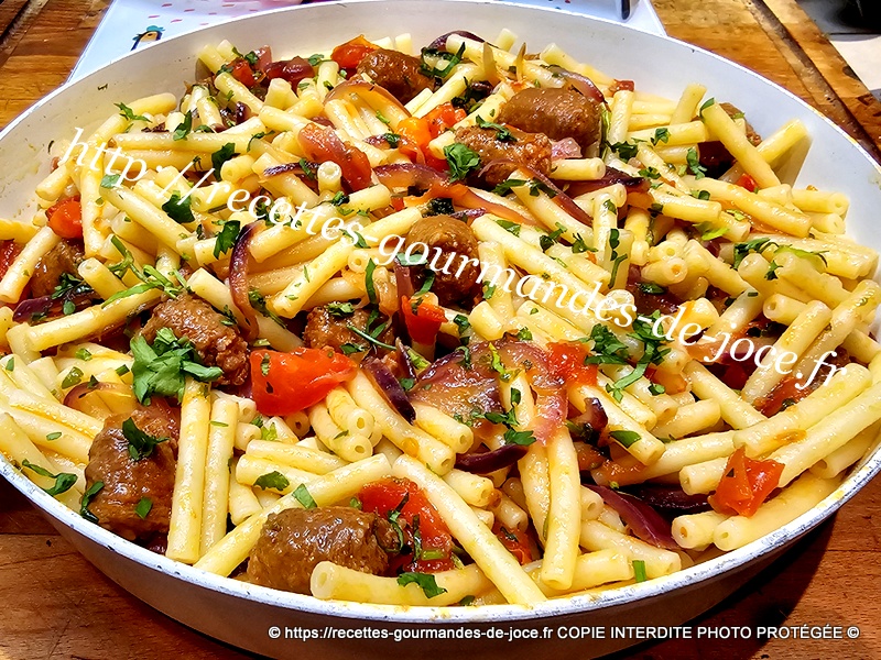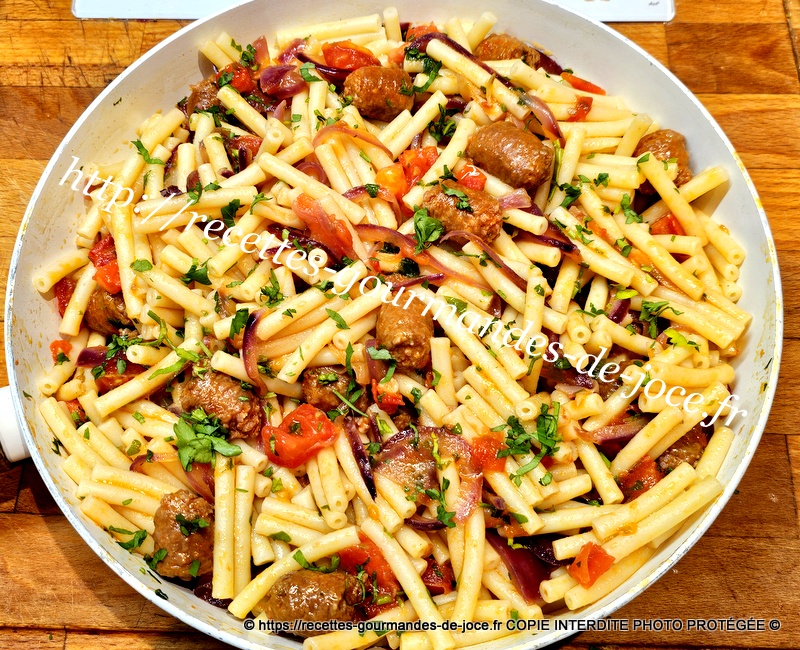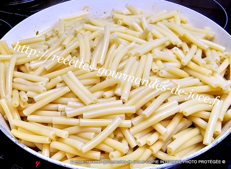 Égoutter les pâtes dès qu’elles sont cuites et les ajouter dans la poêle, mélanger et servir sans attendre.