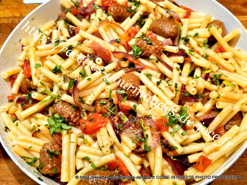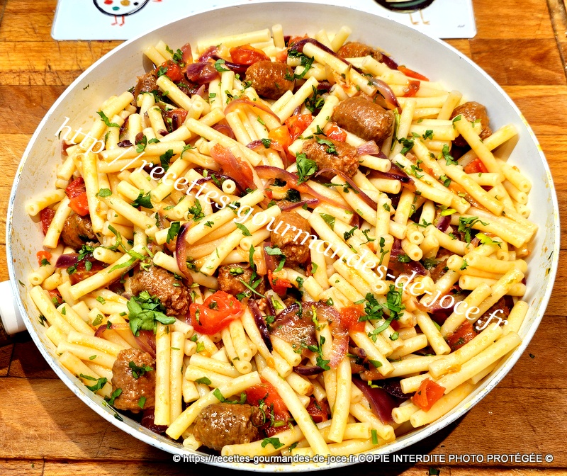 Laisser suer quelques instants puis ajouter les tomates, saler et poivrer, mélanger et laisser cuire en remuant régulièrement, surveiller la cuisson des pâtes. Lorsque les merguez sont cuites, ajouter le persil et mélanger.