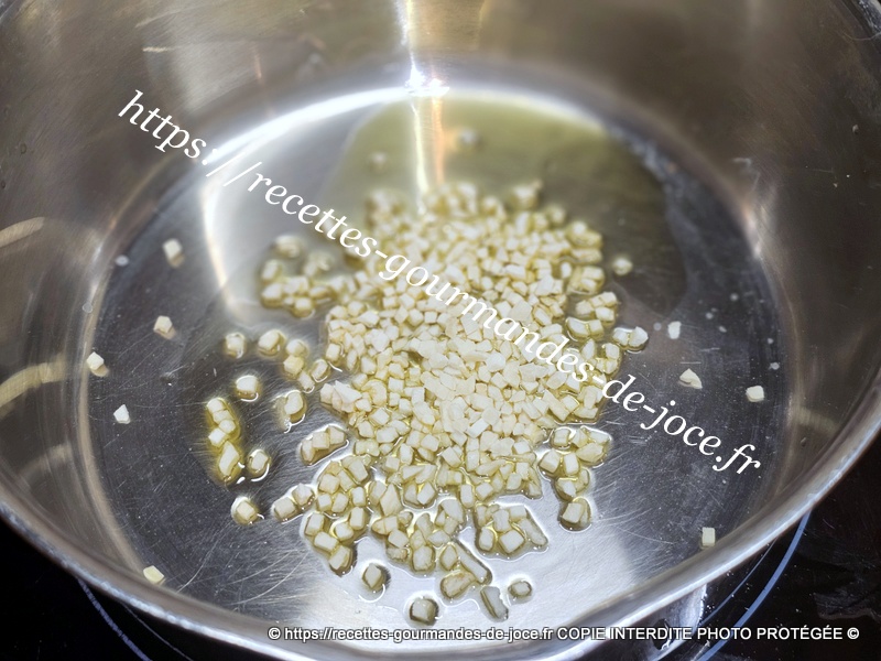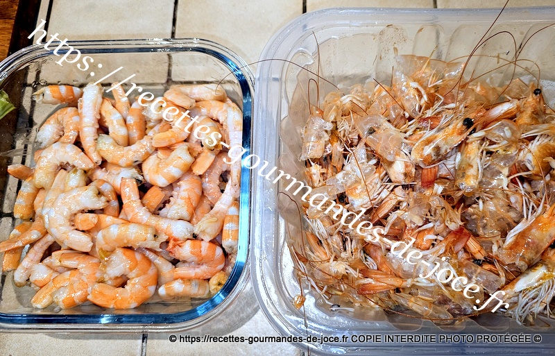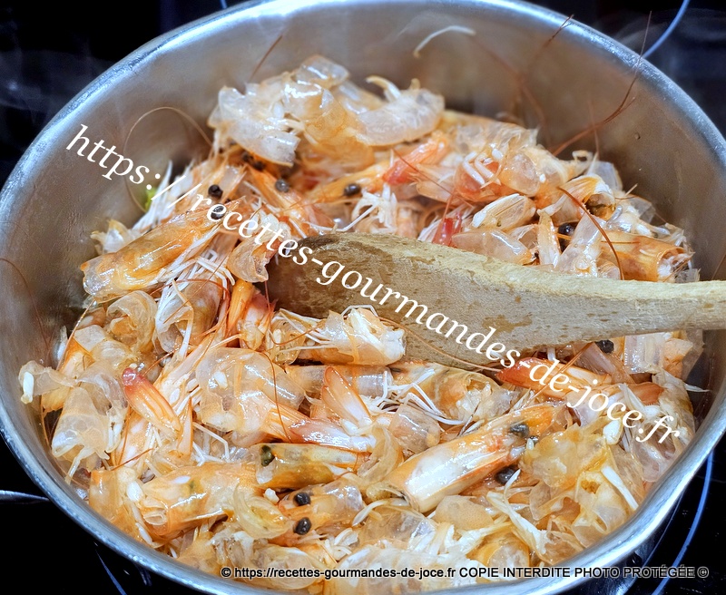 Décortiquer les crevettes et garder les parures, dans une casserole, mettre un filet d’huile d’olive, ajouter l’ail et faire suer quelques instants sans coloration.