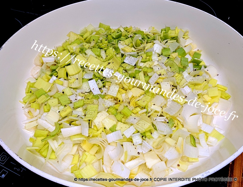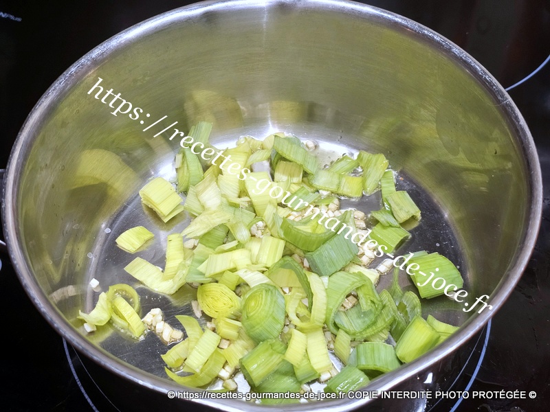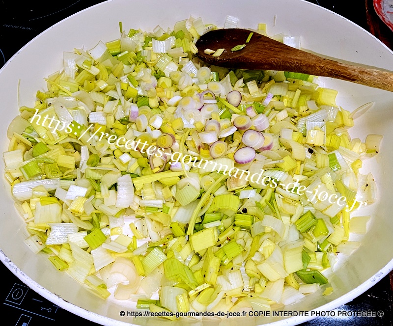 Ciseler les tiges d’oignon, dans une sauteuse, mettre un filet d’huile d’olive, ajouter les poireaux.