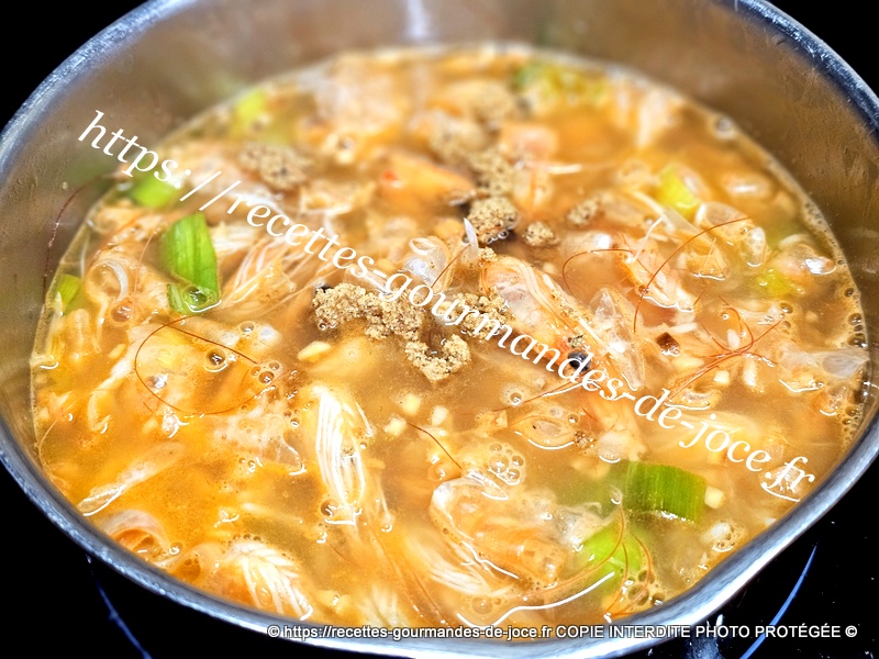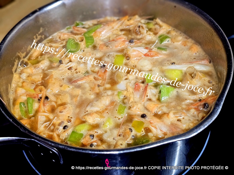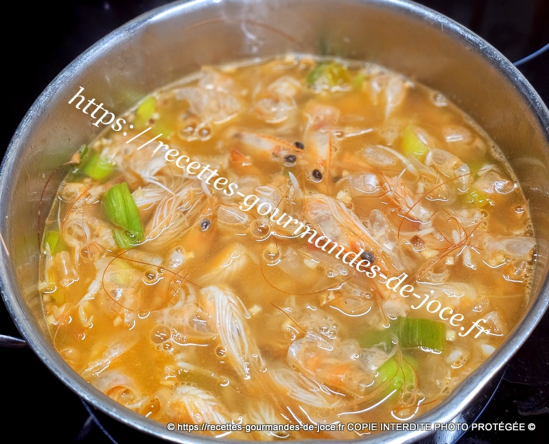 Ajouter le vert des poireaux lavé et émincé ainsi que les parures de crevettes. Faire suer quelques instants puis couvrir d’eau.