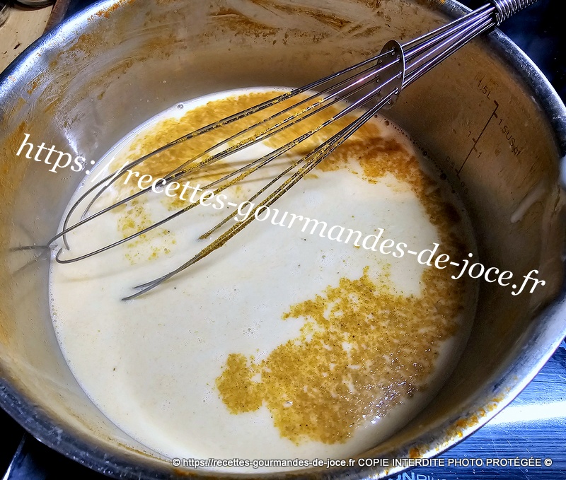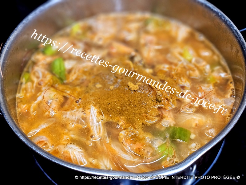 Remettre une partie dans la casserole, ajouter la crème et la c à s restante de curry et mettre à chauffer quelques instants, (laisser refroidir et congeler la deuxième partie du bouillon pour une autre recette 😉 ).