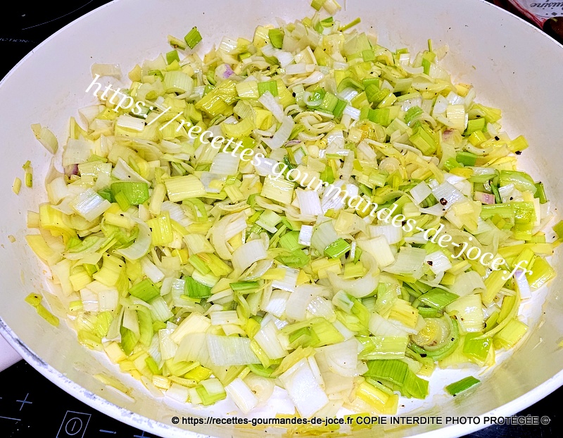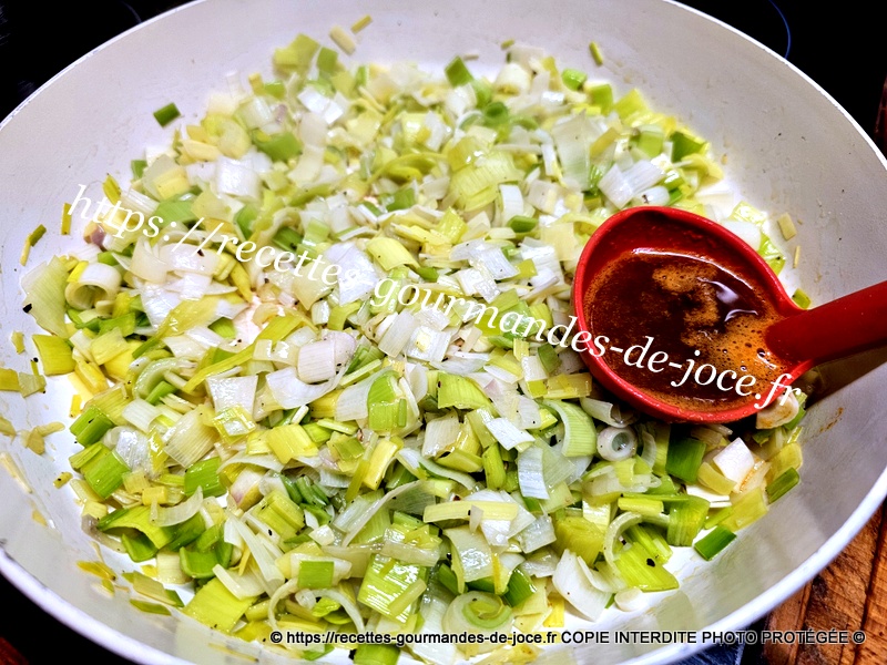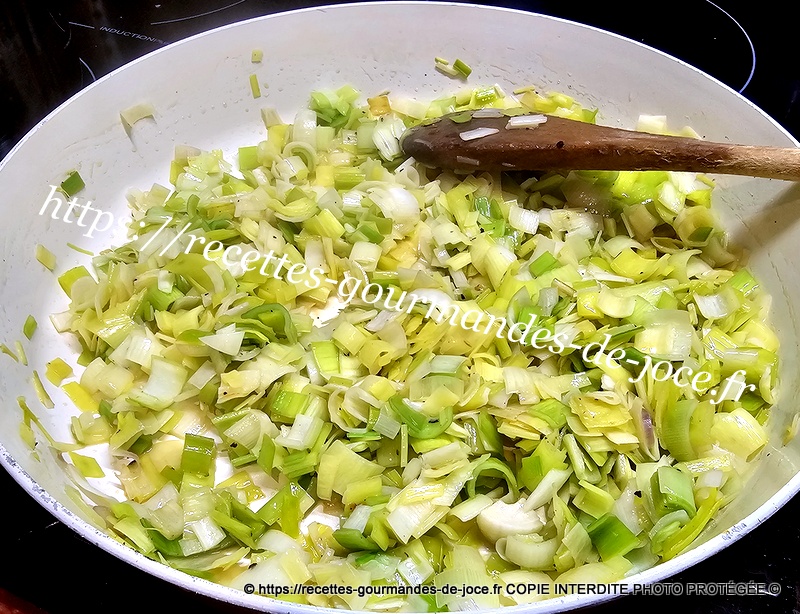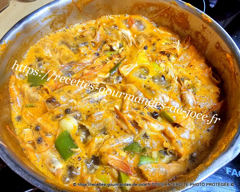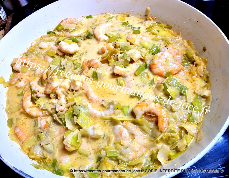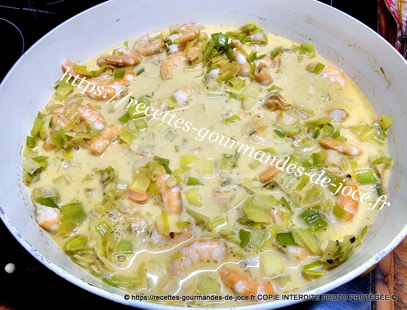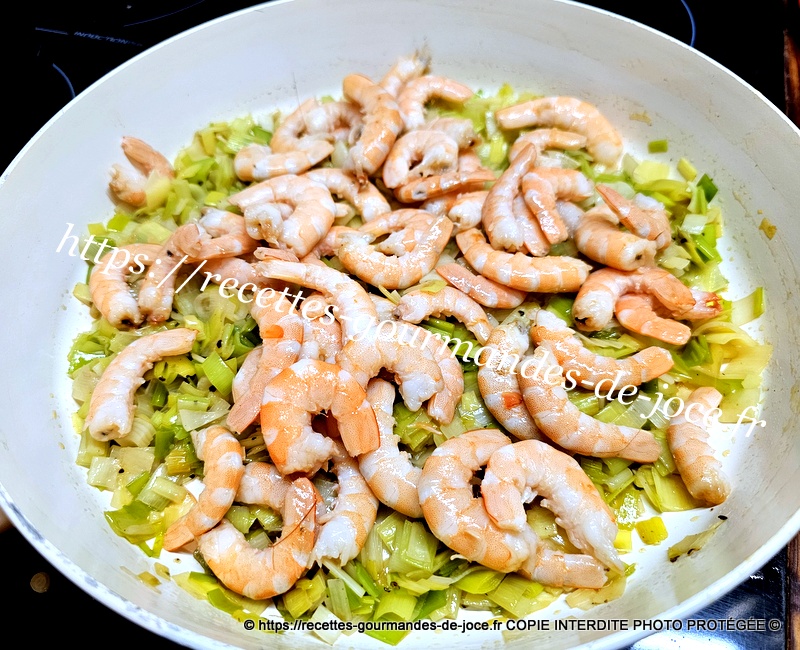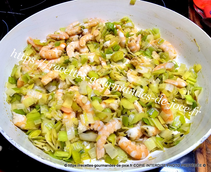 Mélanger et laisser cuire jusqu’à cuisson complète des poireaux, remuer régulièrement. Ajouter ensuite les crevettes et mélanger, laisser chauffer 2 minutes puis réserver au chaud.
