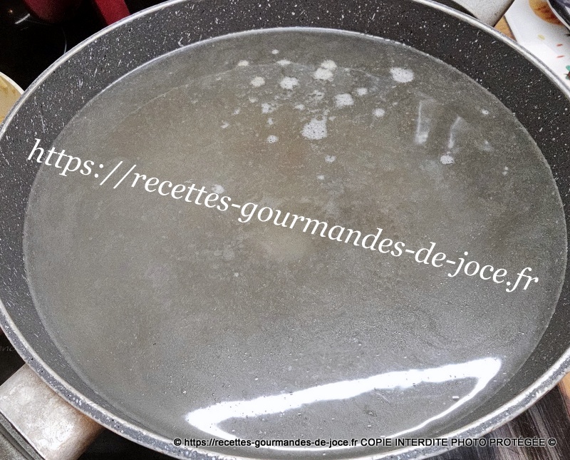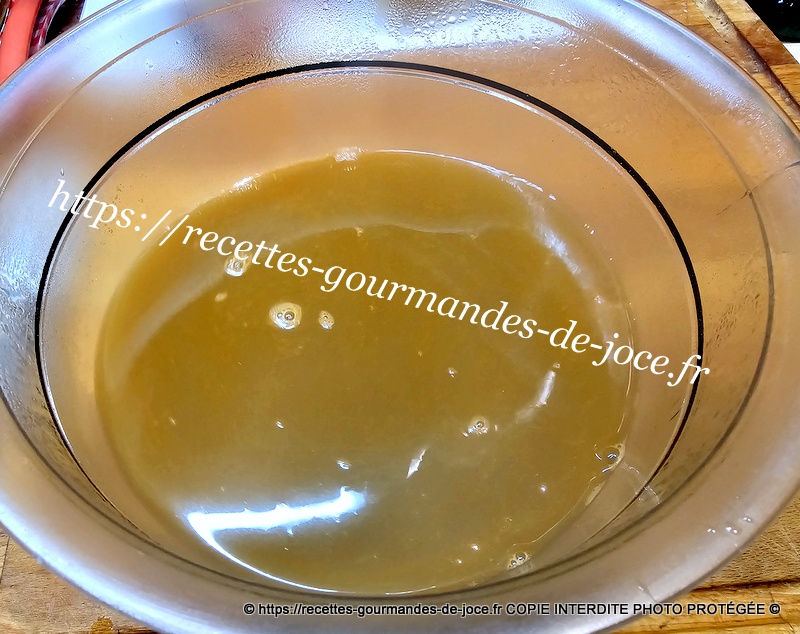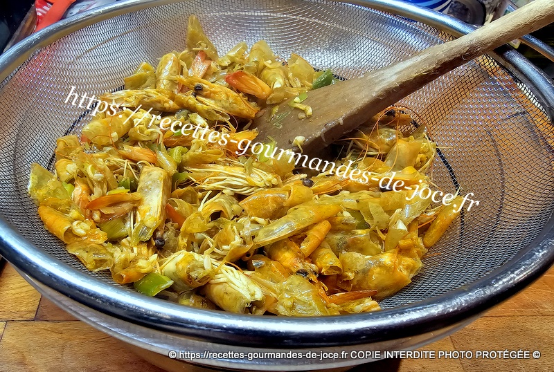 Verser votre bouillon de crevettes dans une passoir fine, récupérer le jus et le diviser en deux parties.