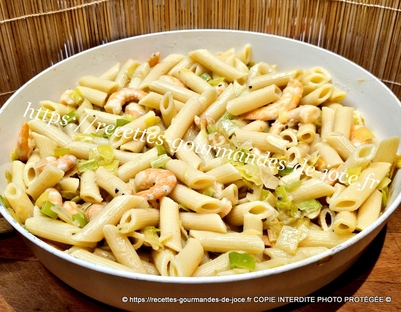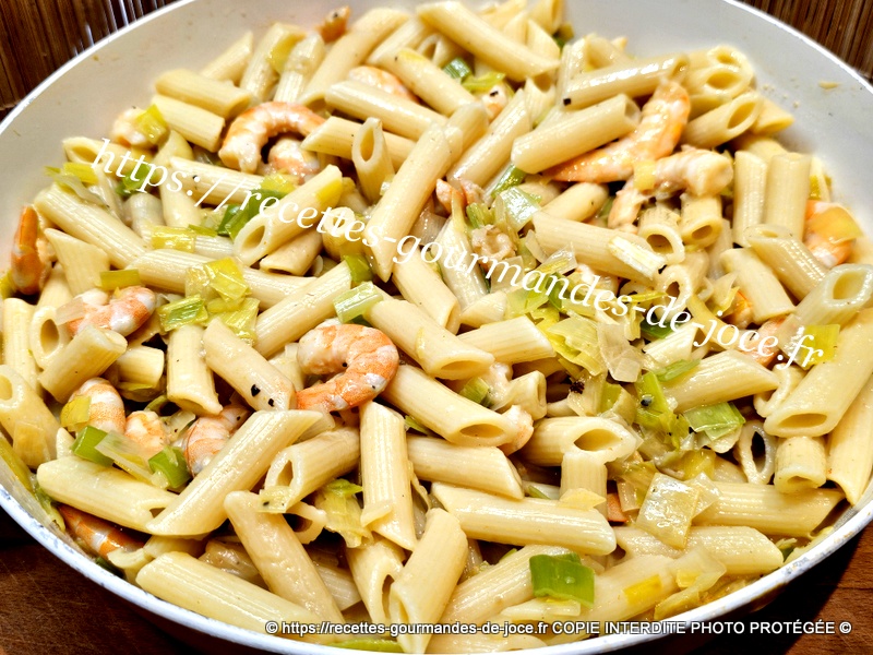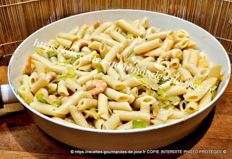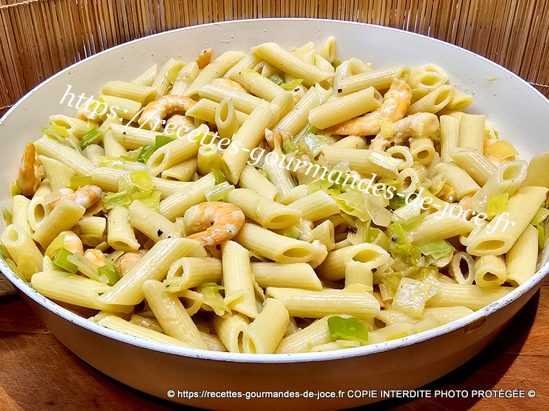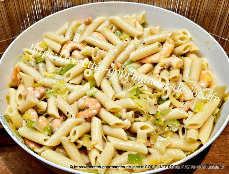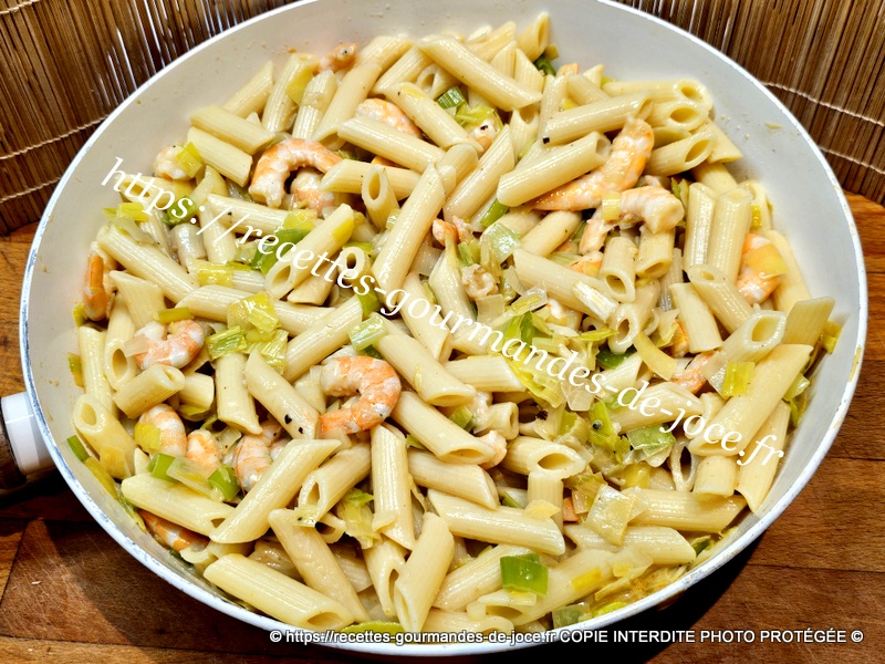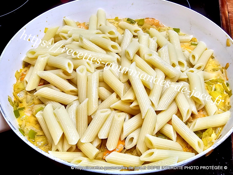 Verser la sauce dans les poireaux aux crevettes et mélanger. Égoutter les pâtes.