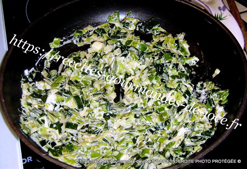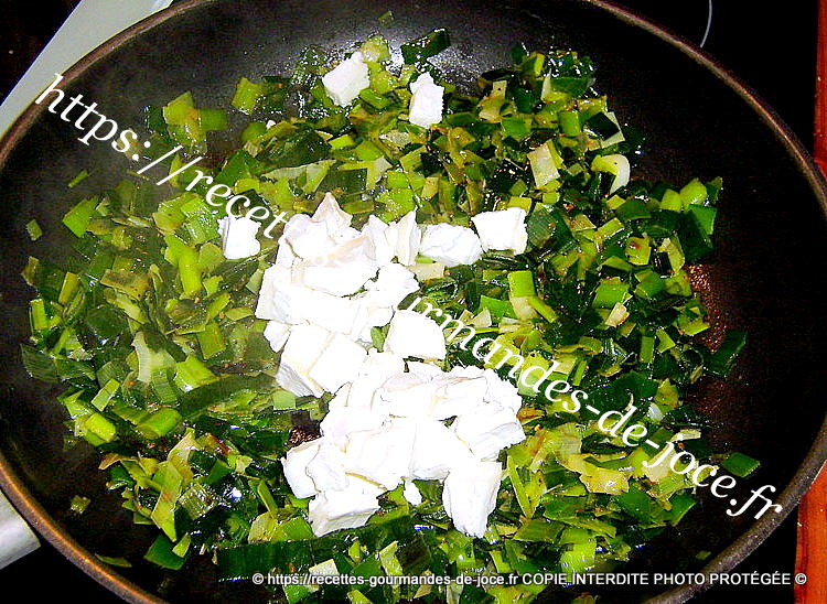 Ajouter les poireaux et saler légèrement, les laisser cuire doucement, remuer souvent et ajouter 1 ou 2 c à s d’eau si besoin, ils ne doivent pas colorer. Ajouter quand ils sont devenus tendres les épices, le chèvre et mélanger.