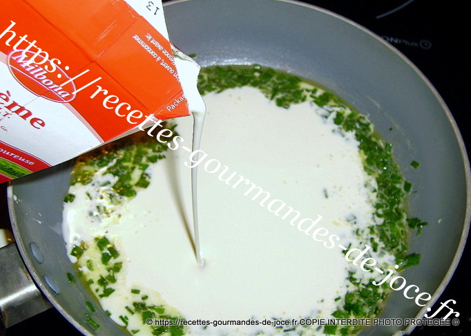 Mettre le beurre à fondre dans une poêle. Ajouter les ¾ de la ciboulette (le beurre doit juste être fondu sans coloration). Enrober la ciboulette du beurre et ajouter la crème. Saler et poivrer.