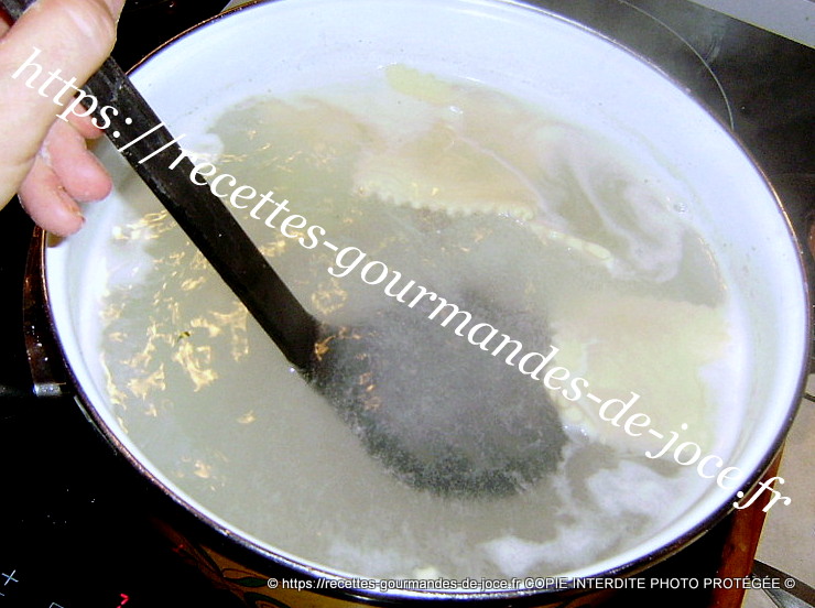 Mettre de l’eau salée avec une c à s d’huile d’olive à bouillir, y verser les ravioles. Les cuire environ 5/10 minutes selon l’épaisseur et vos goûts. Lorsqu’ils remontent en surface ils sont pour ainsi dire cuits, goûtez en un et poursuivez la cuisson si nécessaire. Les récupérer à l’aide d’une écumoire dès qu’ils sont cuits.