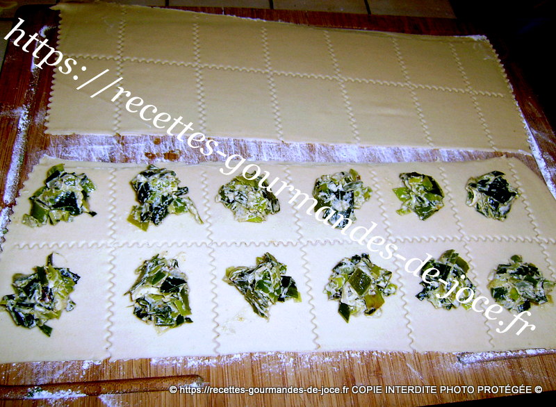 Passez la pâte dans le laminoir de façon à obtenir des bandes fines et régulières, plusieurs passages sont nécessaires en commençant du plus gros écartement et en finissant par le plus petit. Déposer vos bandes sur le plan de travail fariné et répartir ensuite des tas de farce sur la moitié des bandes à intervalles réguliers, humecter avec de l’eau le tour de la farce. Recouvrir des bandes restantes.