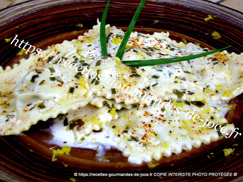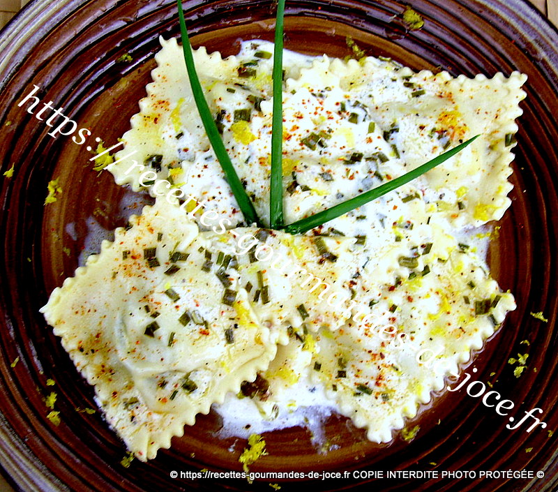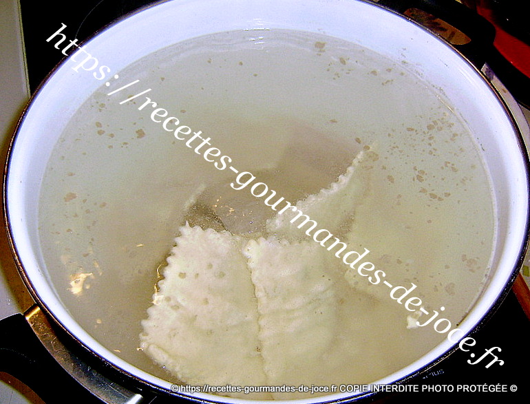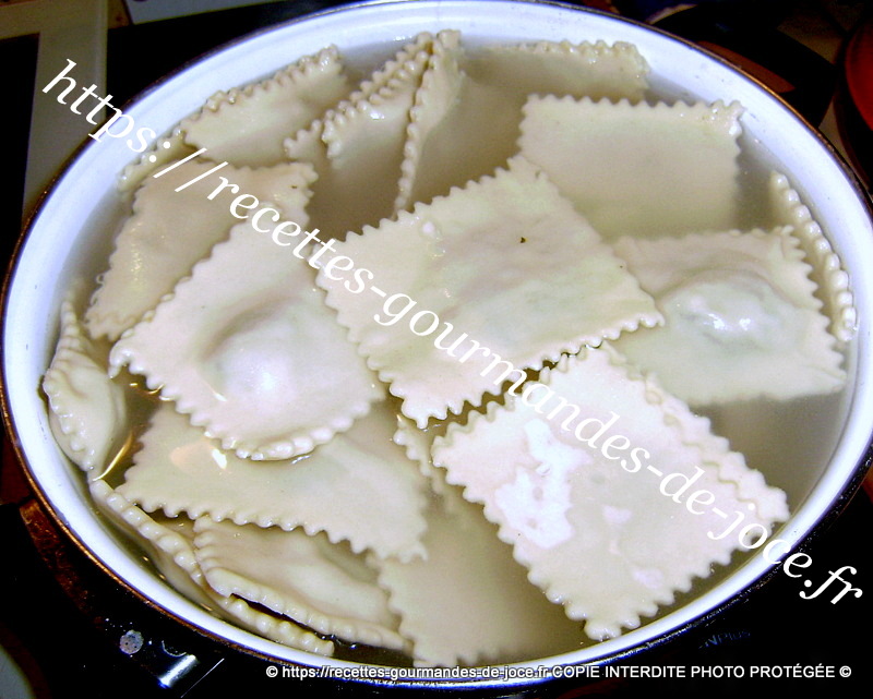Mettre de l’eau salée avec une c à s d’huile d’olive à bouillir, y verser les ravioles. Les cuire environ 5/10 minutes selon l’épaisseur et vos goûts. Lorsqu’ils remontent en surface ils sont pour ainsi dire cuits, goûtez en un et poursuivez la cuisson si nécessaire. Les récupérer à l’aide d’une écumoire dès qu’ils sont cuits.