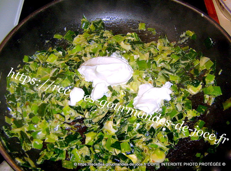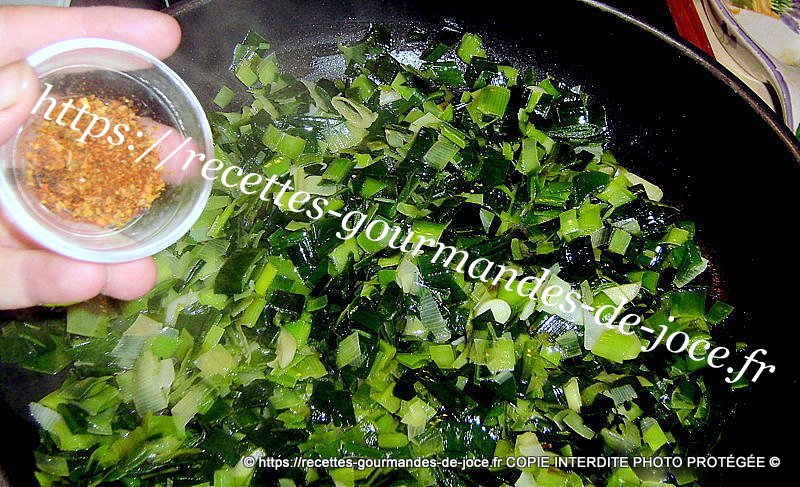 Ajouter les poireaux et saler légèrement, les laisser cuire doucement, remuer souvent et ajouter 1 ou 2 c à s d’eau si besoin, ils ne doivent pas colorer. Ajouter quand ils sont devenus tendres les épices, le chèvre et mélanger.