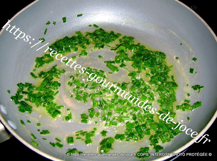 Mettre le beurre à fondre dans une poêle. Ajouter les ¾ de la ciboulette (le beurre doit juste être fondu sans coloration). Enrober la ciboulette du beurre et ajouter la crème. Saler et poivrer.