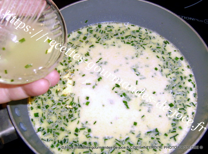 Les verser dans la sauce que vous avez maintenue au chaud, mélanger délicatement et parsemer de la ciboulette restante et du zeste du citron ainsi qu’un peu de piment d’Espelette.