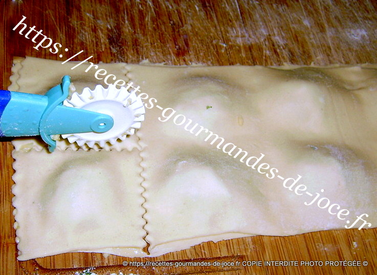 Passer une roulette dentelée pour couper vos ravioles. Déposer vos ravioles dans un plat fariné, le temps de faire les suivants.