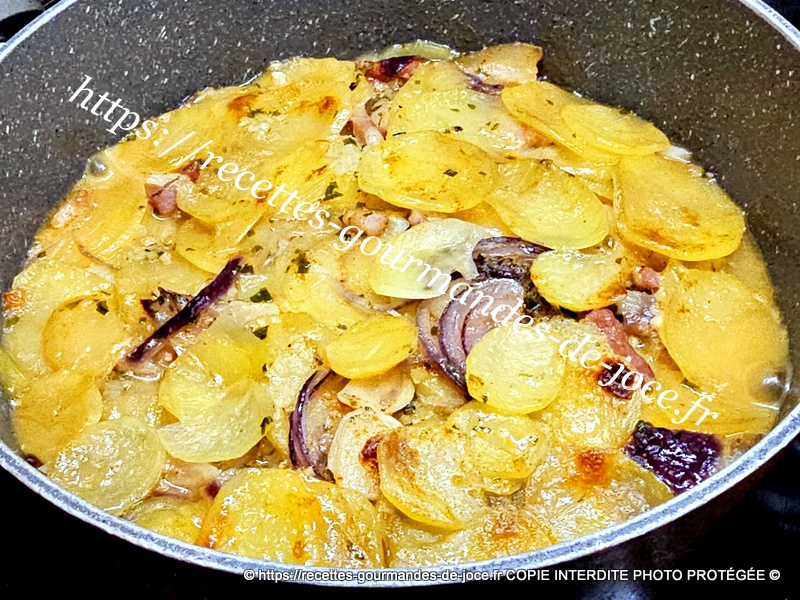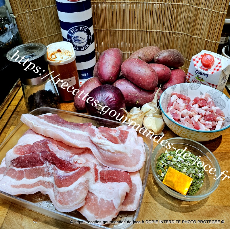 Dissoudre le cube de bouillon de volaille dans les 250 ml d’eau chaude, peler, laver et couper les pommes de terre à la mandoline, peler et émincer l’oignon et les gousses d’ail dégermées, couper les tranches de poitrine en 3. Dans une cocotte répartir la matière grasse.