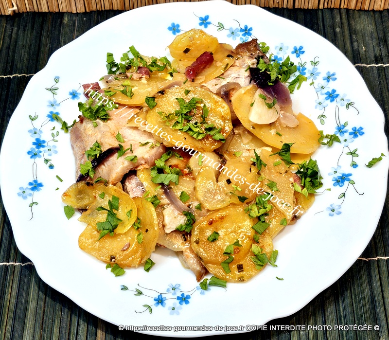 Recouvrir du 2 -ème tiers de pommes de terre et recommencer avec le sel, le poivre, la persillade, 1 c à s de paprika fumé, l’ail, l’oignon, les lardons et le reste de poitrine de porc, ajouter pour finir le dernier tiers de pommes de terre, saler et poivrer à nouveau répartir la dernière c à s de paprika fumé. Verser la brique de crème liquide.