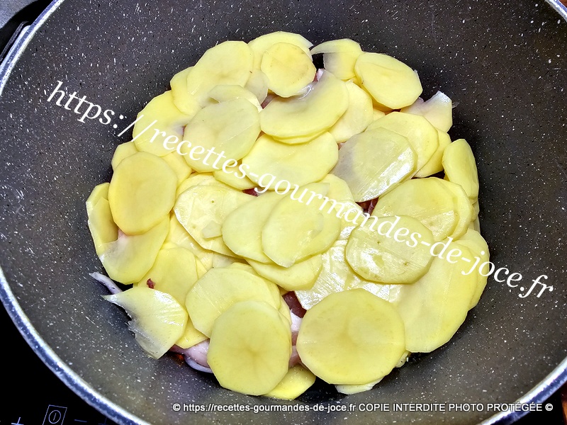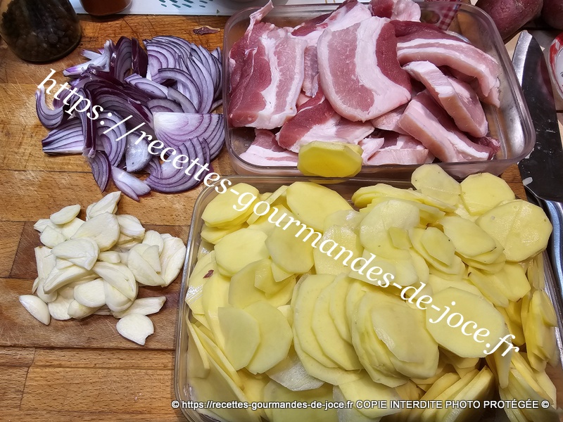 Dissoudre le cube de bouillon de volaille dans les 250 ml d’eau chaude, peler, laver et couper les pommes de terre à la mandoline, peler et émincer l’oignon et les gousses d’ail dégermées, couper les tranches de poitrine en 3. Dans une cocotte répartir la matière grasse.