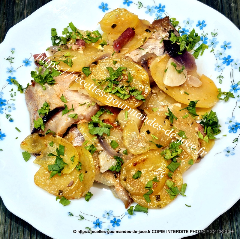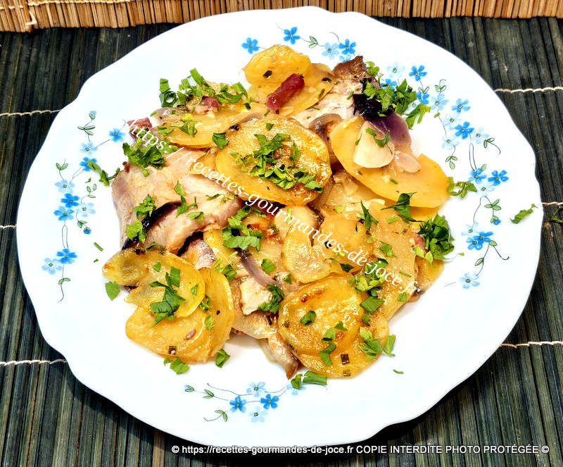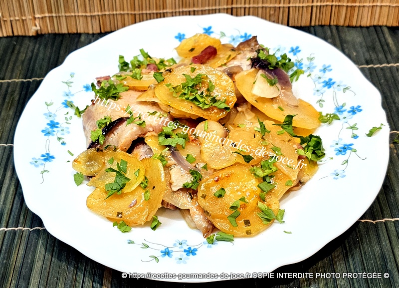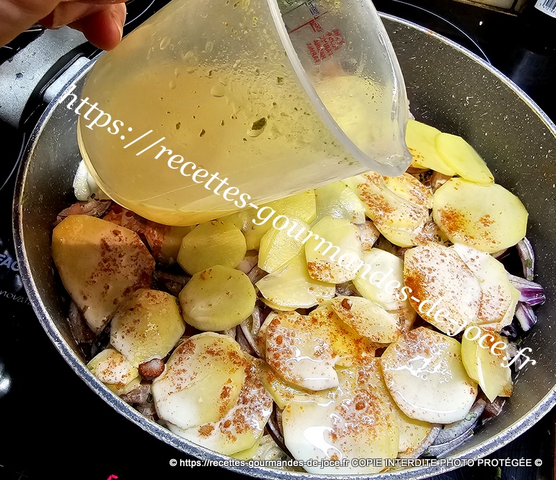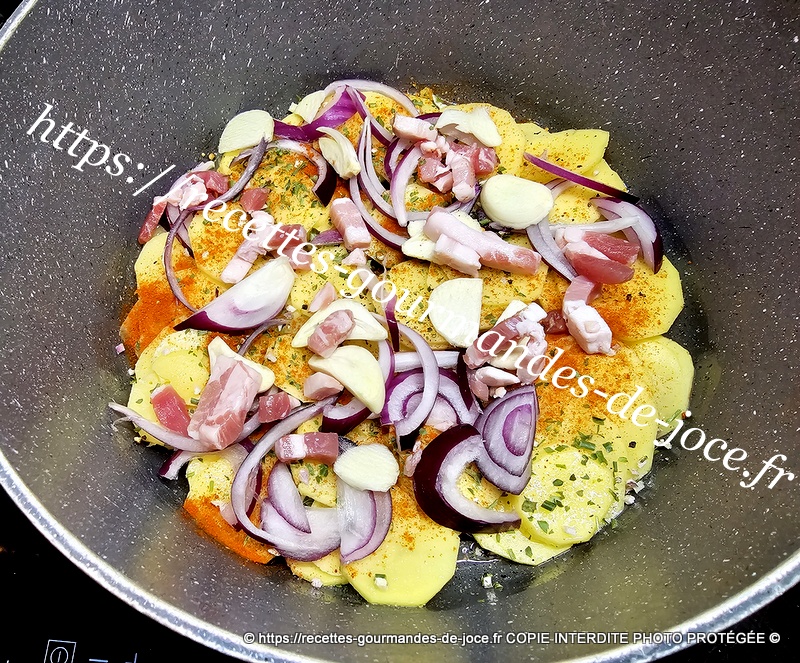 Recouvrir du 2 -ème tiers de pommes de terre et recommencer avec le sel, le poivre, la persillade, 1 c à s de paprika fumé, l’ail, l’oignon, les lardons et le reste de poitrine de porc, ajouter pour finir le dernier tiers de pommes de terre, saler et poivrer à nouveau répartir la dernière c à s de paprika fumé. Verser la brique de crème liquide.