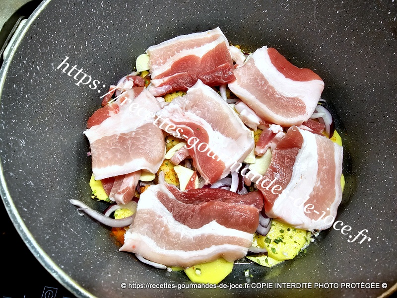 Répartir la moitié des oignons et de l’ail et ajouter la moitié des lardons et des morceaux de poitrine de porc.