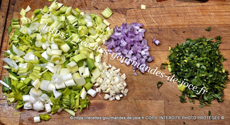Dissoudre le cube de bouillon de volaille dans 1 litre d’eau chaude, laver et émincer les poireaux, peler et hacher l’échalion et les gousses d’ail dégermées, laver et ciseler le persil. Décortiquer les crevettes et les couper en deux.
