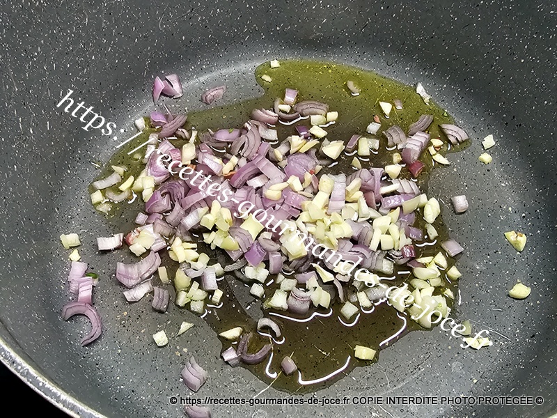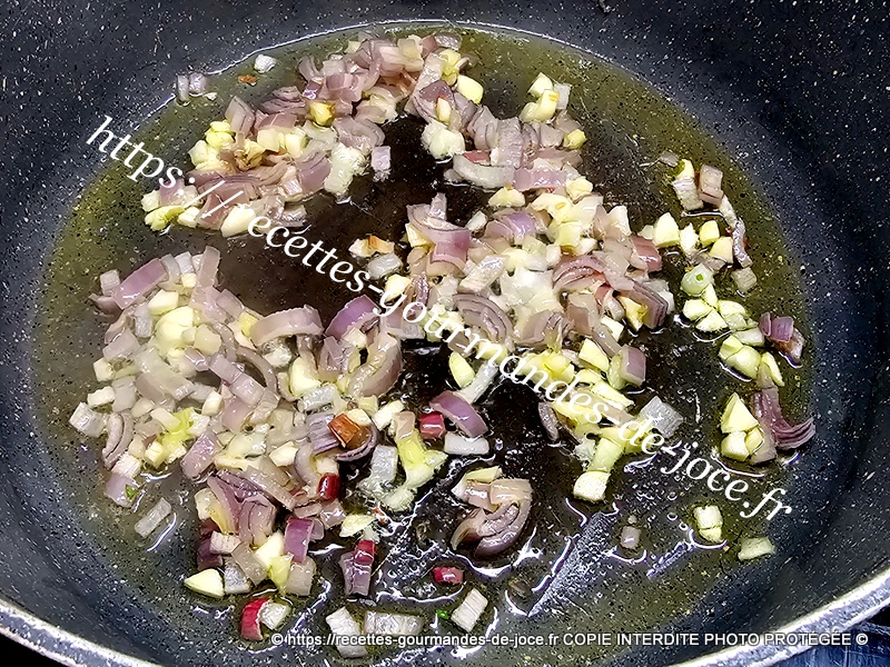 Dans un faitout, mettre un filet d’huile d’olive à chauffer, puis ajouter l’échalion et l’ail, les faire suer sans coloration.