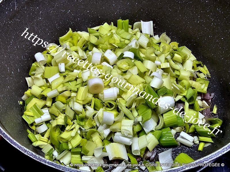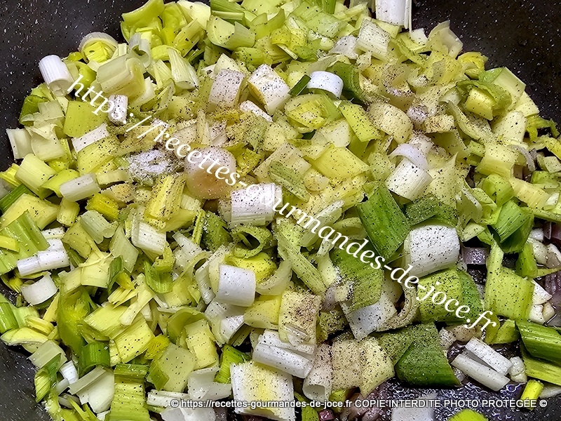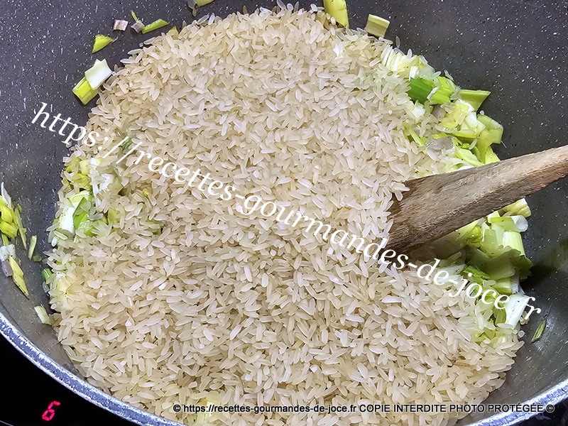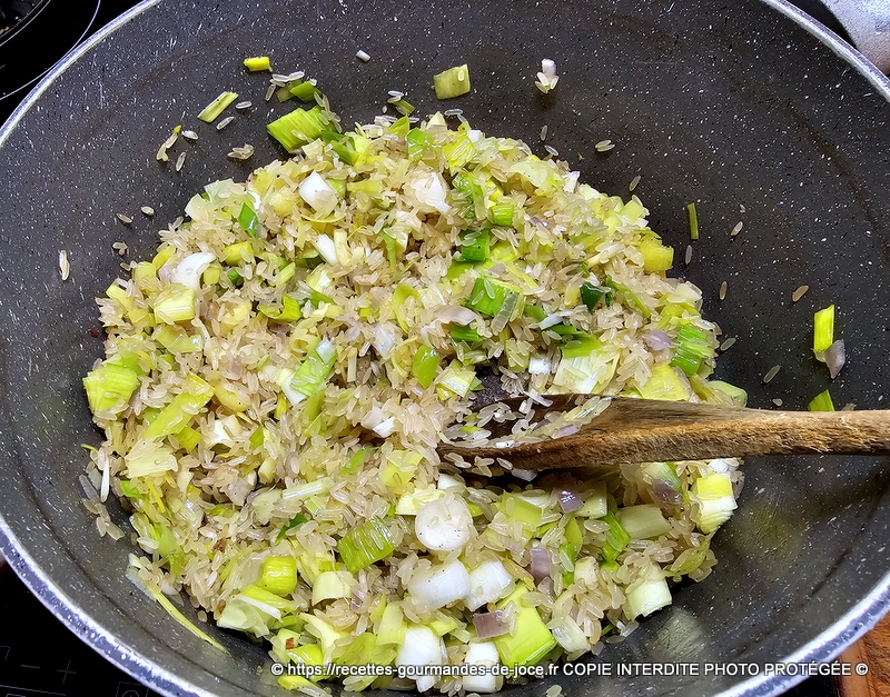 Ajouter ensuite les poireaux, saler et poivrer, les faire suer également quelques instants, ajouter ensuite le riz.