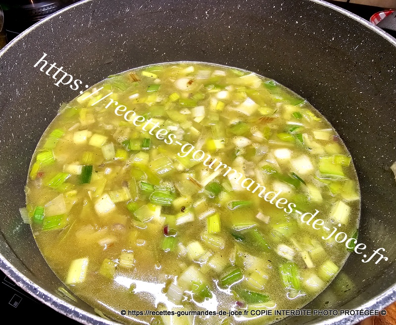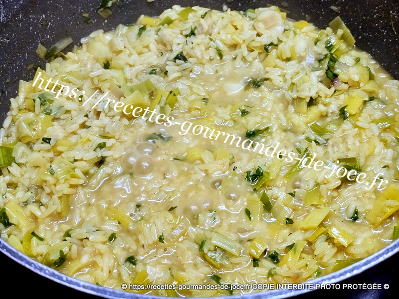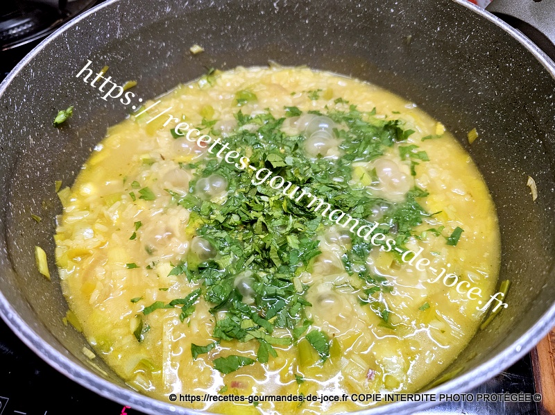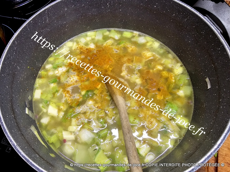 Bien mélanger pour le faire nacrer, ajouter ensuite le bouillon de volaille et remuer. Ajouter ensuite les épices et laisser mijoter.