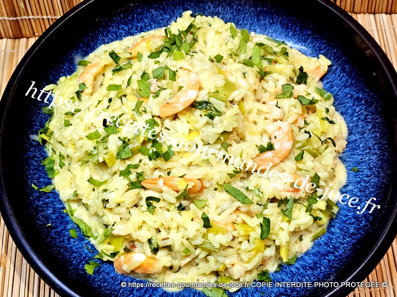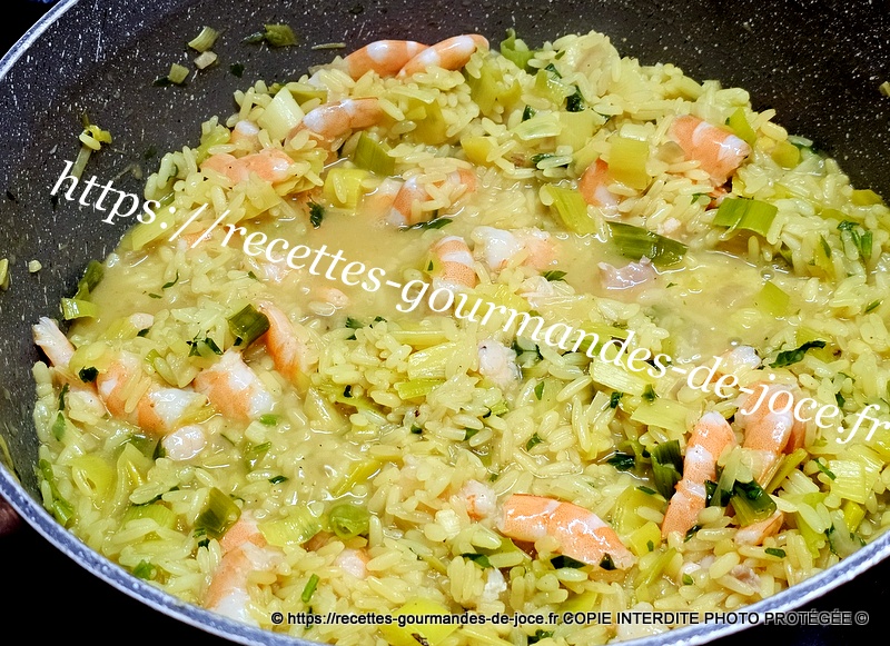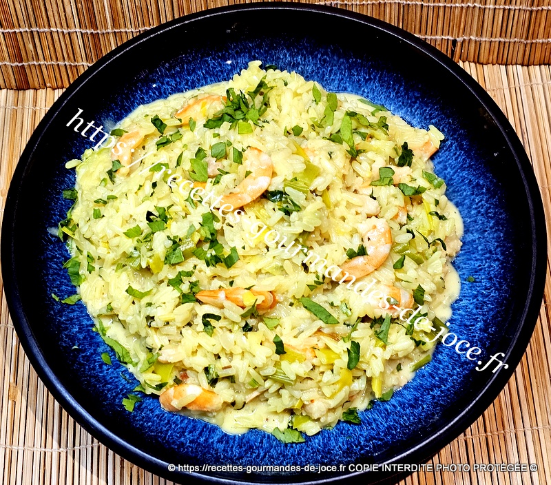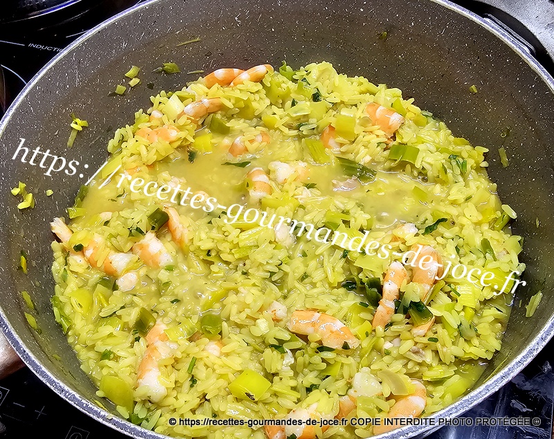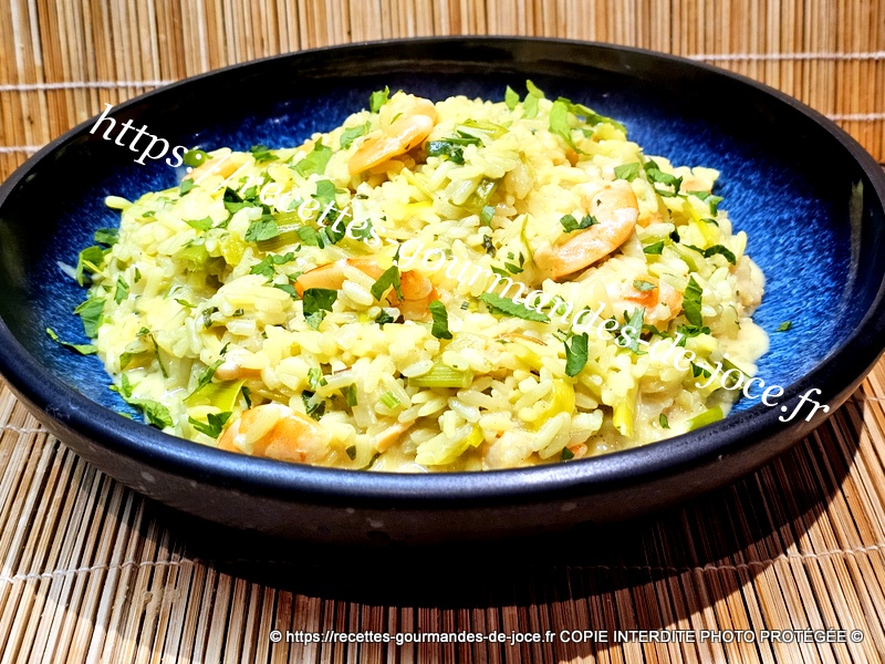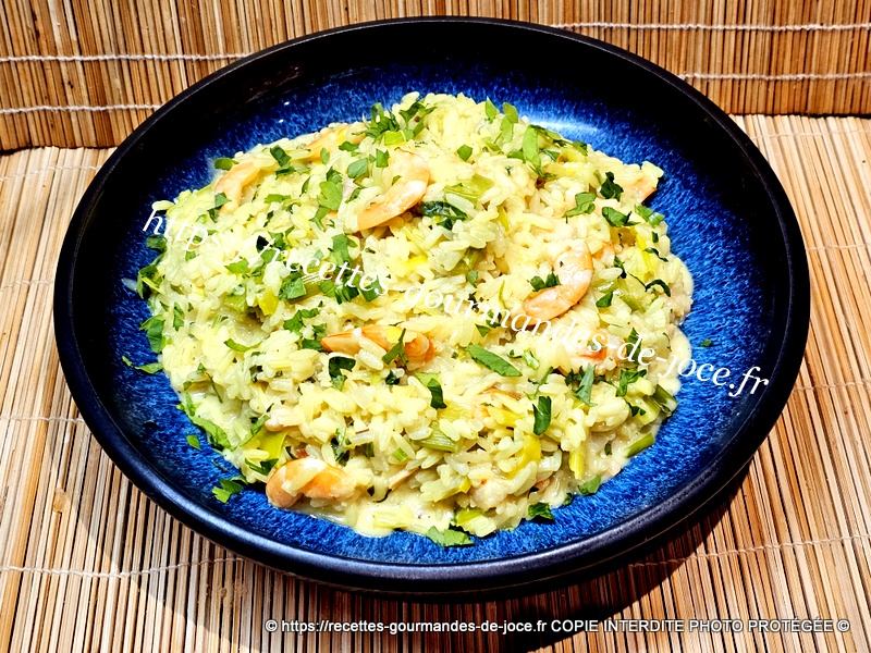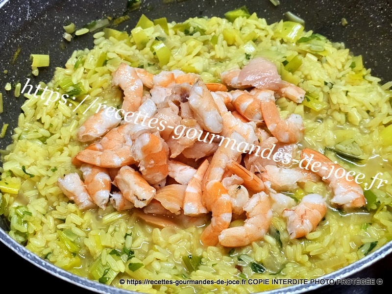 Riz épicé aux poireaux et crevettes.