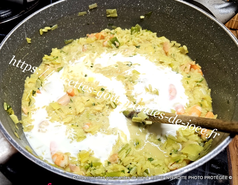 Lorsque le riz est cuit cette fois, ajouter la crème, mélanger et servir sans attendre.
