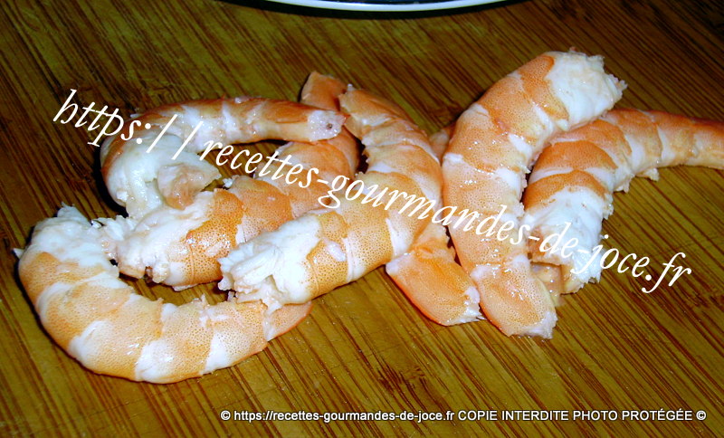Mélanger. Répartir dans des ramequins en forme de coquilles St Jacques. Décortiquer les crevettes.