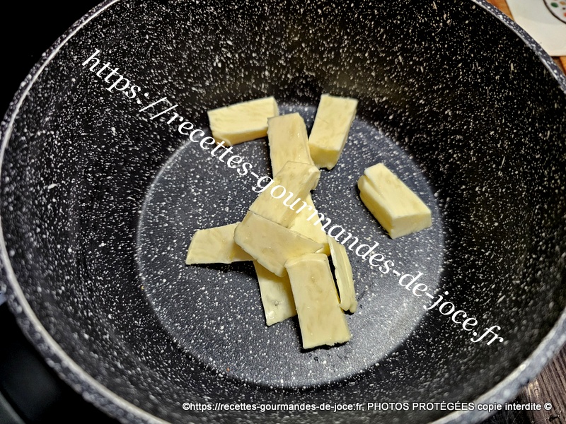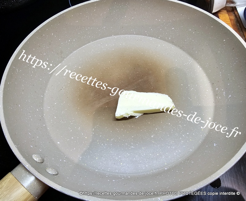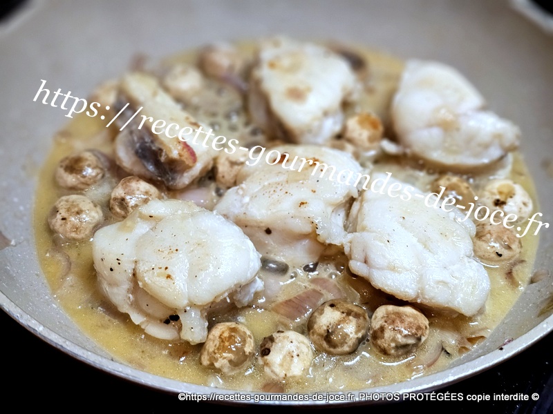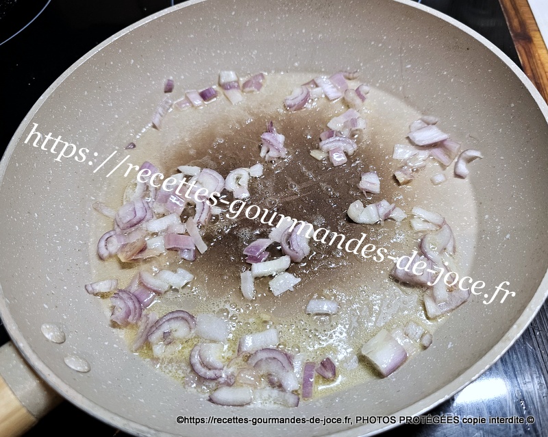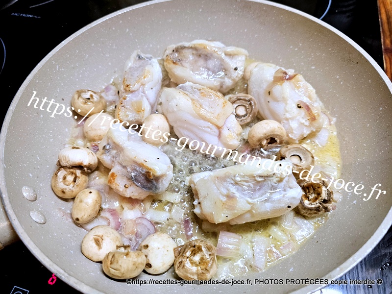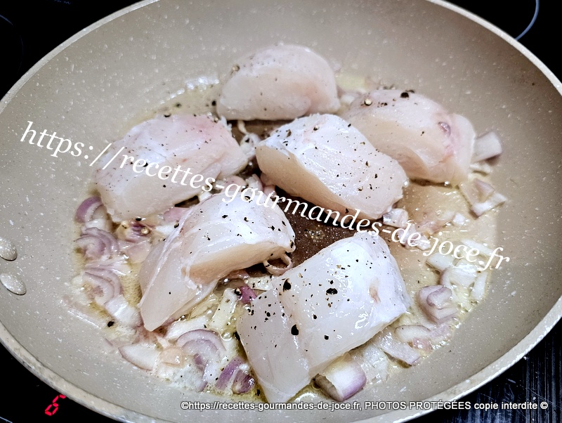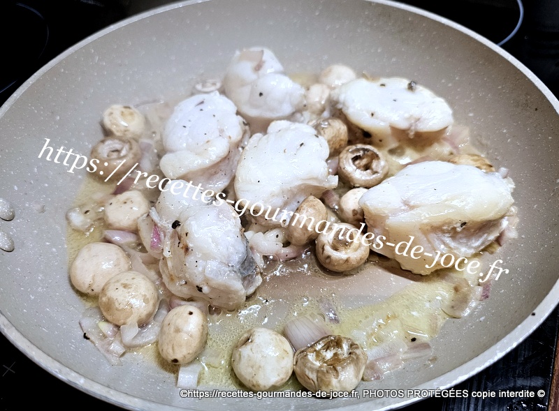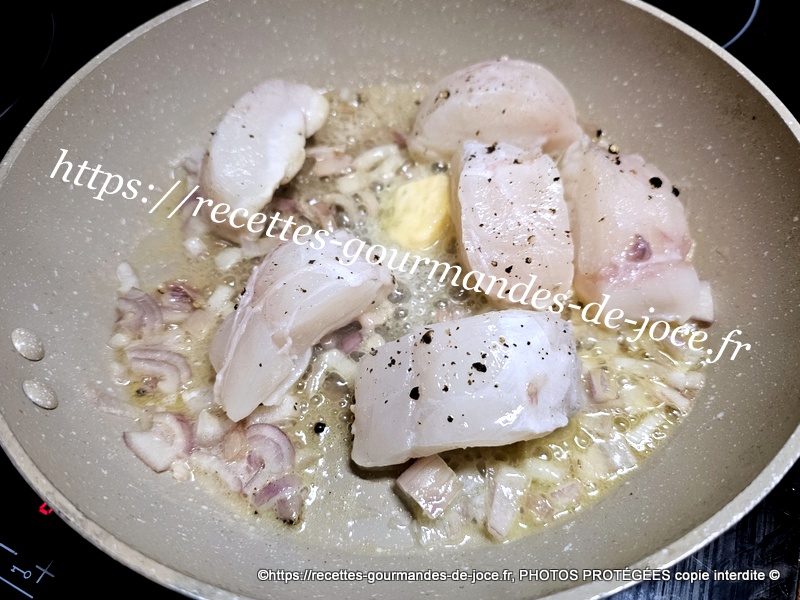Dans une poêle mettre à fondre un morceau de beurre, ajouter l’échalion et le faire suer sans coloration, ajouter ensuite les morceaux de lotte.