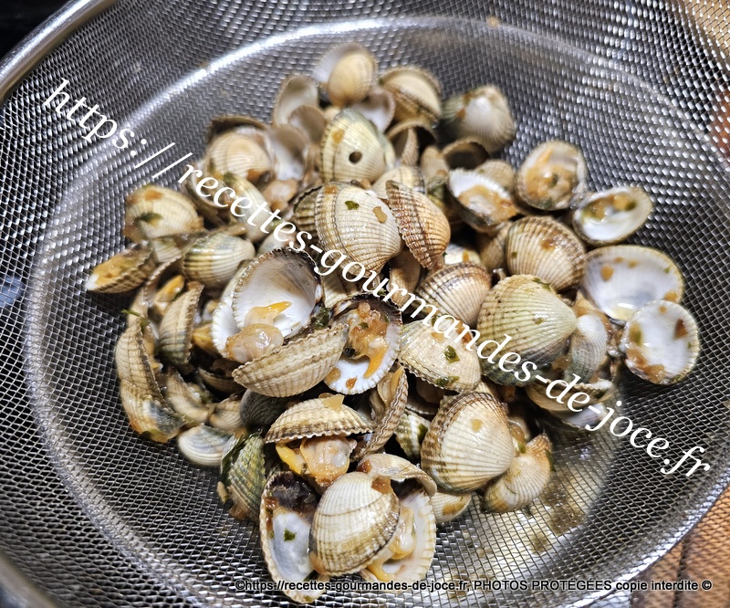 Cuire les coques selon la recette donnée plus haut, les égoutter en filtrant le jus de cuisson que vous garderez.