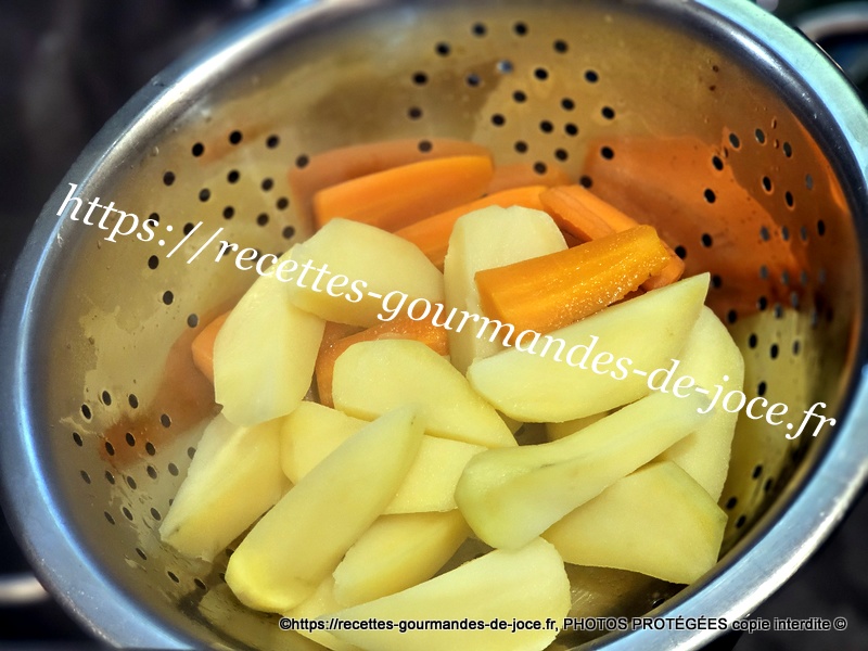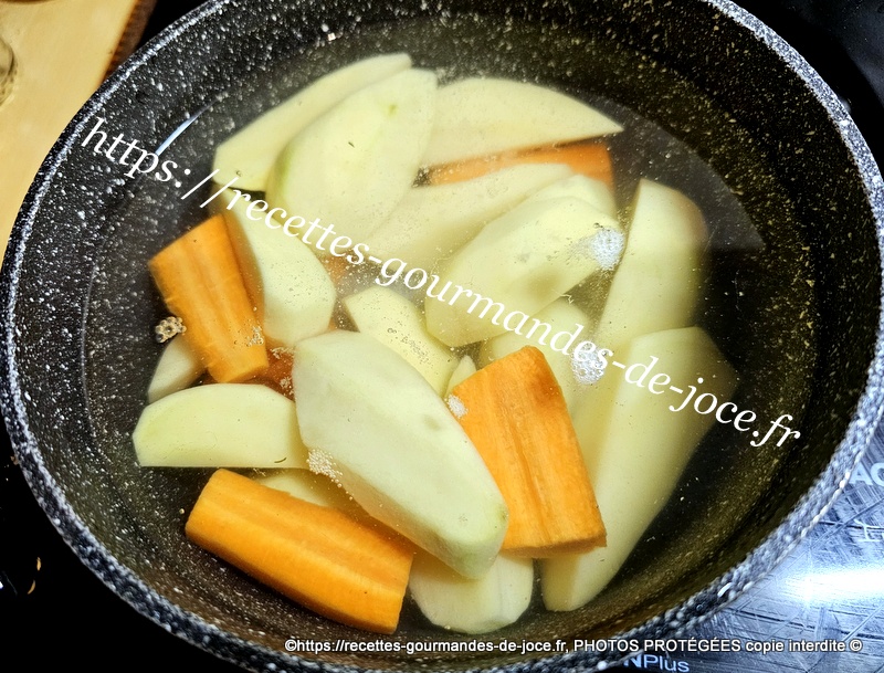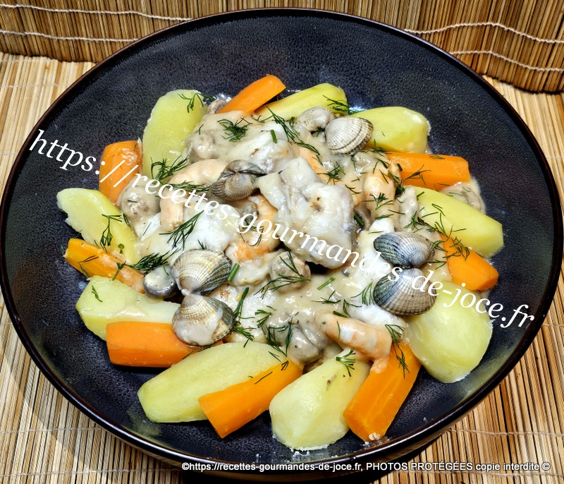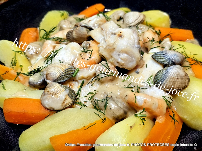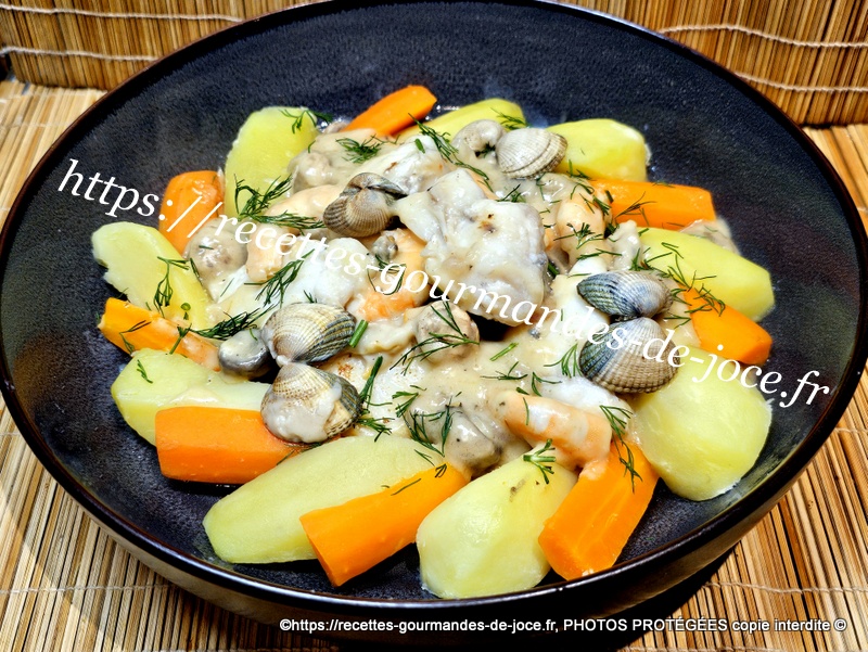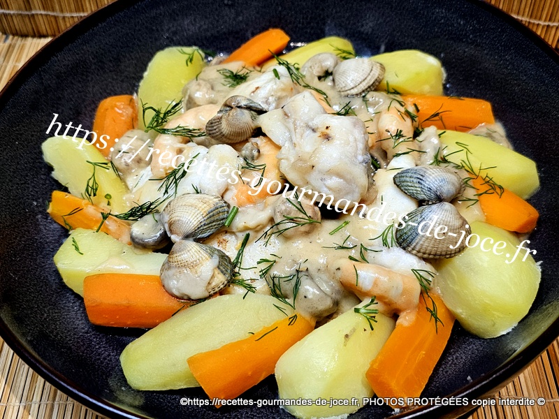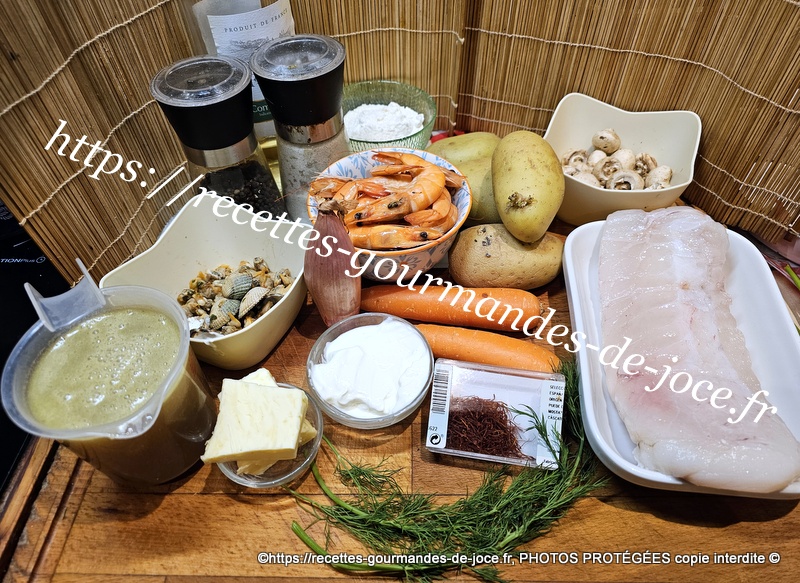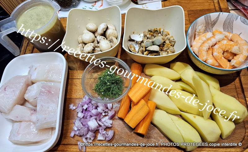 Décoquiller les coques, couper le filet de lotte en tronçons, peler, laver et couper les pommes de terre et les carottes, peler et hacher l’échalion, laver les champignons, décortiquer les crevettes et ciseler l’aneth. Mettre les pommes de terre et les carottes à cuire dans une casserole d’eau salée, lorsqu’elles sont cuites les égoutter et les réserver au chaud.