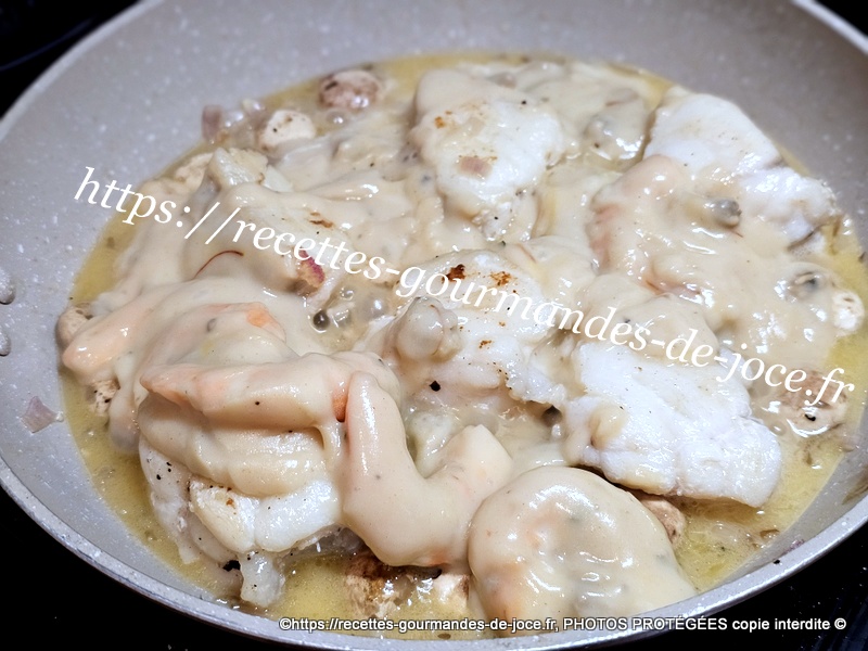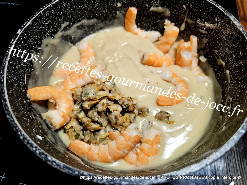 Laisser épaissir et cuire à feu doux environ 2 minutes en remuant. Saler et poivrer et arrêter la cuisson, ajouter la crème et mélanger, puis ajouter les coques et les crevettes, mélanger et réserver.