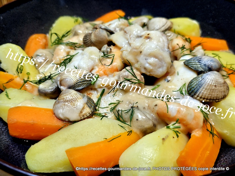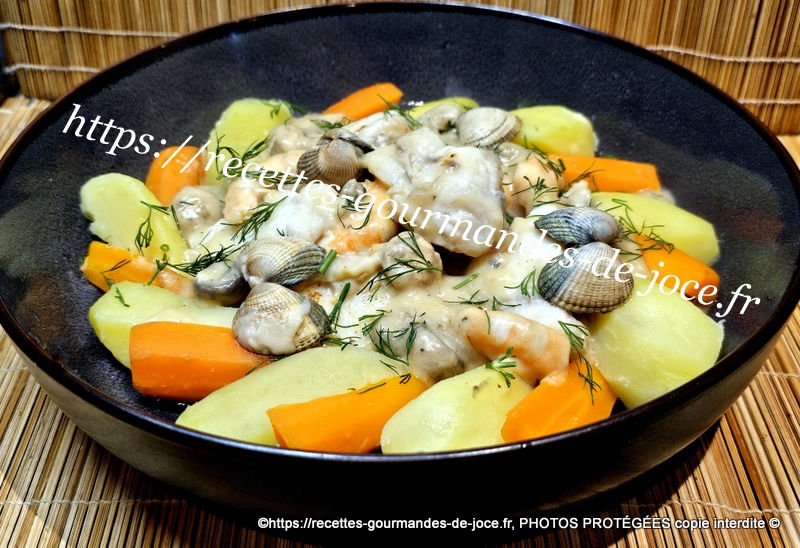 Ajouter la sauce aux fruits de mer, mélanger et servir avec les pommes de terre et les carottes, parsemer le tout d’aneth ciseler.