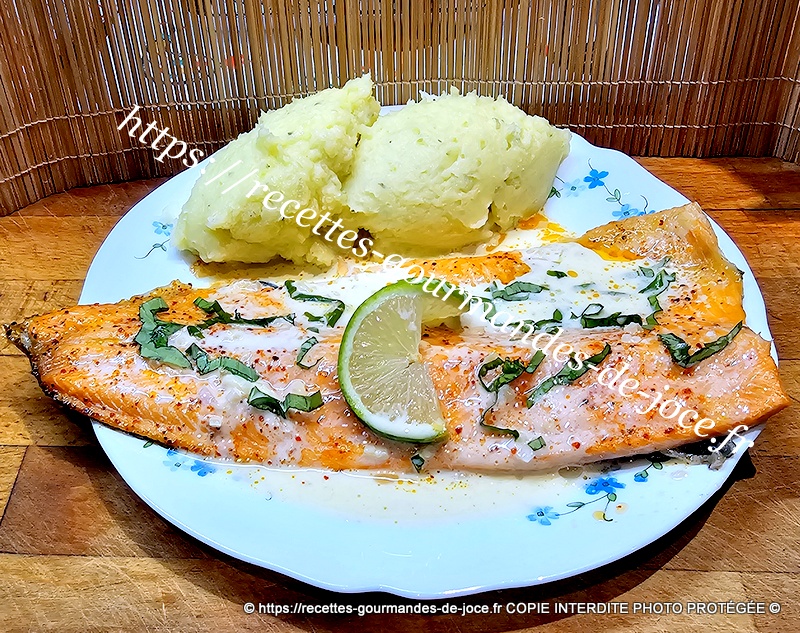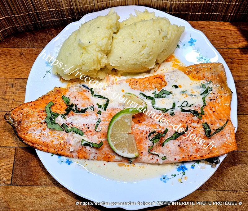 Filet de truite saumonée, sauce au citron vert, basilic et échalote, purée de pommes de terre.