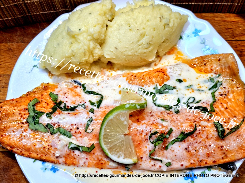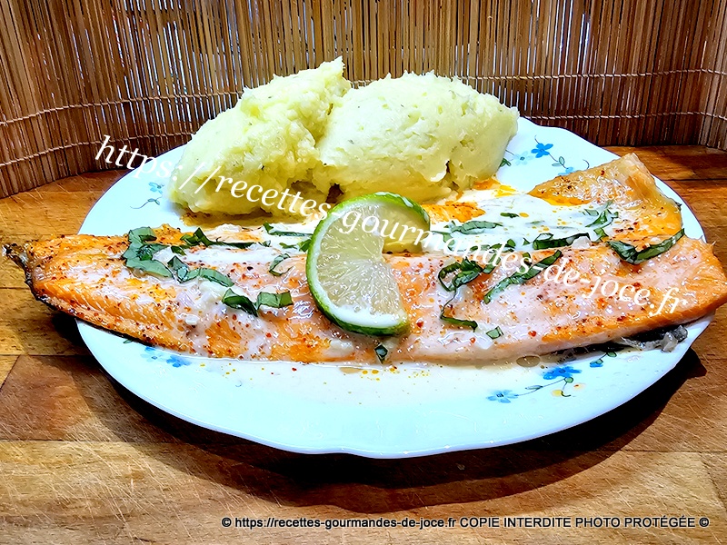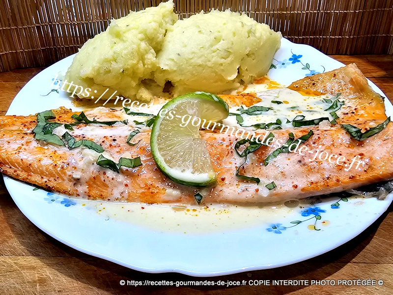 Filet de truite saumonée, sauce au citron vert, basilic et échalote, purée de pommes de terre.