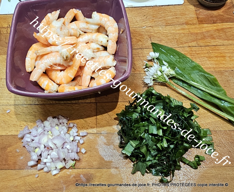Laver et ciseler finement les poireaux, laver et ciseler les aillets ou hacher les gousses d’ail dégermées. Décortiquer les crevettes, peler et hacher l’échalote, laver et ciseler l’ail des ours ou la ciboulette.