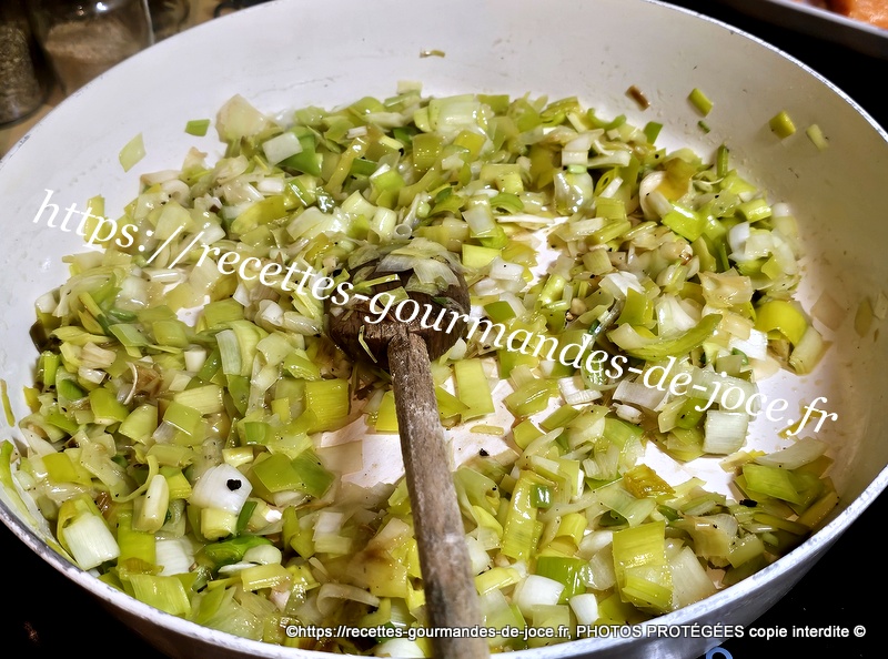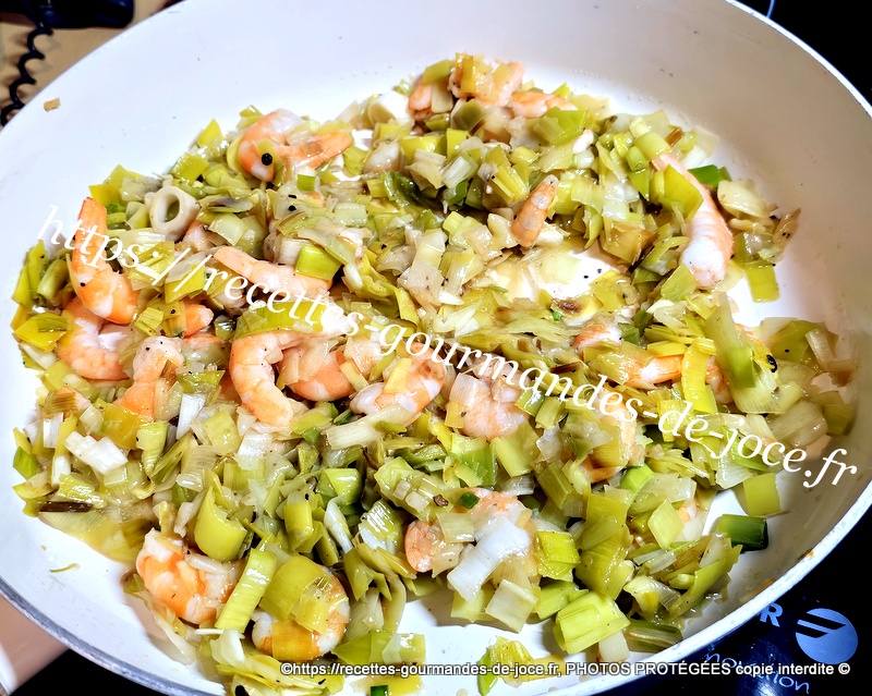 Lorsque les poireaux sont cuits, ajouter les crevettes, mélanger, laisser chauffer quelques instants puis arrêter la cuisson, réserver au chaud.