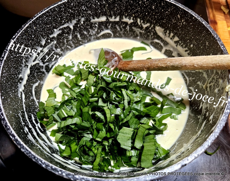 Ajouter ensuite la crème et bien mélanger, laisser chauffer. Lorsque la sauce est chaude, ajouter l’ail des ours ou la ciboulette et arrêter la cuisson.