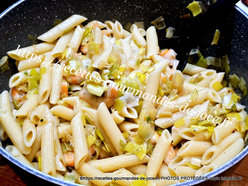Entre temps égoutter les pâtes, ajouter les poireaux dans les pâtes. Bien mélanger.