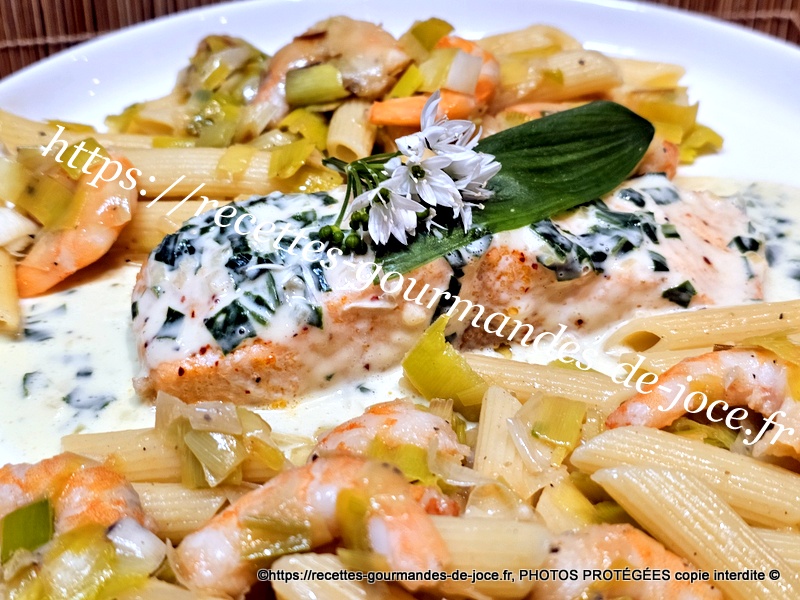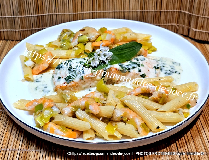 Pavés de saumon à l’ail des ours, pennes aux poireaux et crevettes.