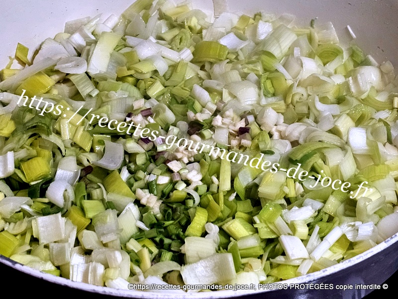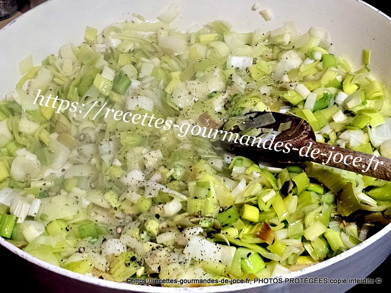 Ajouter l’aillet ou l’ail et saler et poivrer, laisser mijoter à feu doux. Remuer régulièrement.