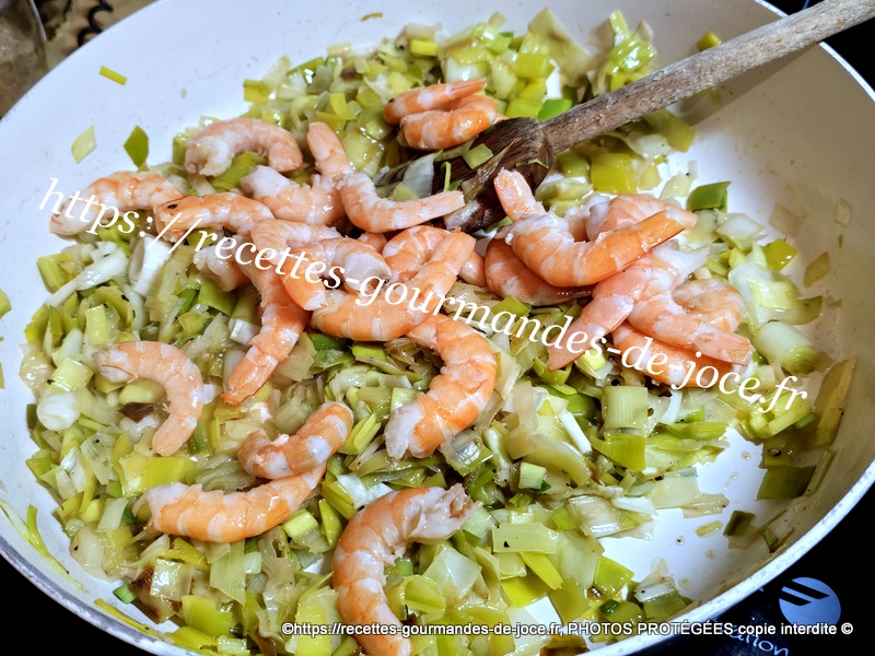 Lorsque les poireaux sont cuits, ajouter les crevettes, mélanger, laisser chauffer quelques instants puis arrêter la cuisson, réserver au chaud.