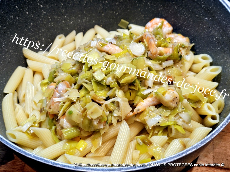 Entre temps égoutter les pâtes, ajouter les poireaux dans les pâtes. Bien mélanger.